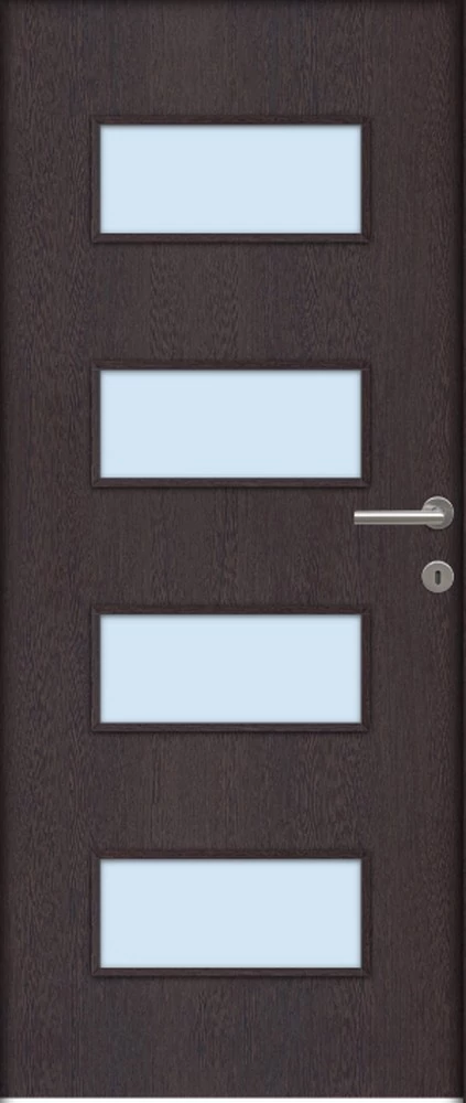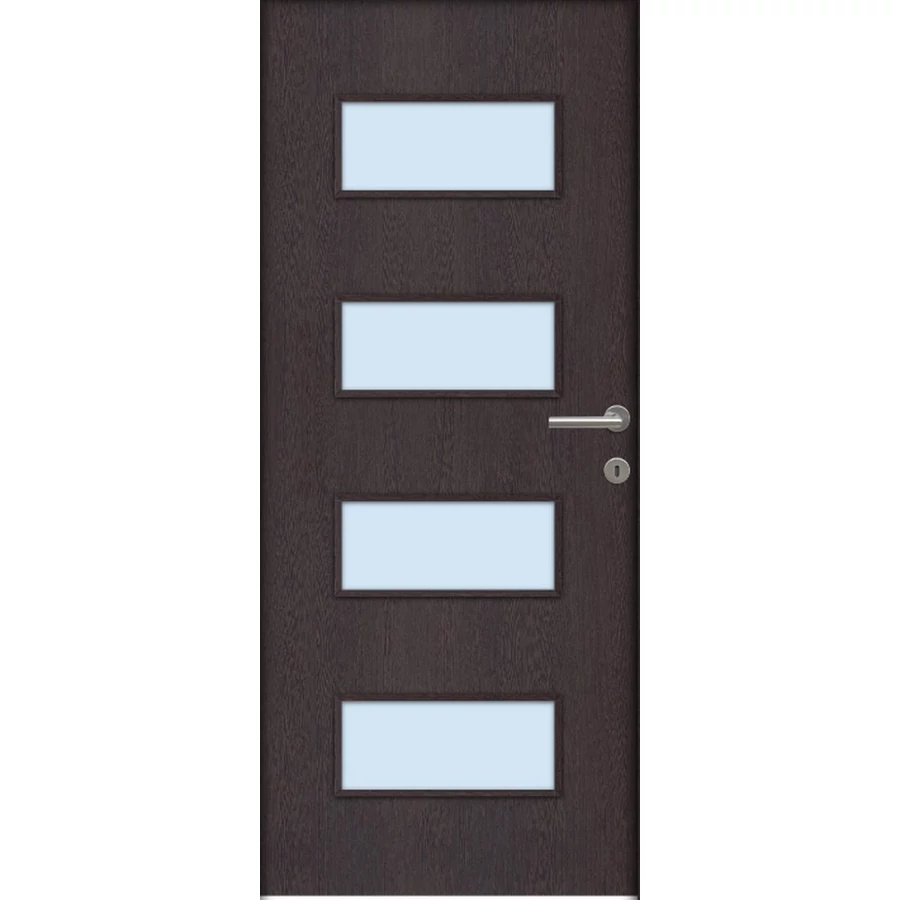 A Missouri savmart üveges ajtó ára nem tartalmazza a tokot, küszöböt és kilincset. A hozzá való tokot fal vastagságtól függően külön kell hozzá kiválasztani, mert a falvastagsághoz méreten különböző áron értékesítjük. A kilincset szintén külön kell kiválasztani, mert többféle tipusból lehet választani és tipusonként eltérnek az árai. Nyitásmódja: egyszárnyú nyíló, nyitásiránya balos ( a zsanéros oldal felől nézve, a zsanér a bal oldalon helyezkedik el ). Tényleges tokmagkülmérete: 72 cm széles 208 cm magas. Színe: wenge. Könnyített szerkezetű falcos kialakítású 40mm vastag beltéri ajtólap. Szerkezeti felépítése : MDF vagy faforgácslap keret kétoldali dekorfóliás felületű HDF lemez borítással. Csak papírrács térkitöltéssel rendelhető függőleges száliránnyal.Az utólag szerelhető dekorfóliával burkolt ajtók költséghatékony megoldást kínálnak. Nyomtatott mintázatuk élethűen jeleníti meg a fa erezetét. A dekor felület nyomtatott famintázatot jelent HDF hordozó felületre ragasztva A fóliás ajtók egyik legnagyobb előnye, hogy: utókezelést nem igényel, már csak használnia kell! A borító felülete egy dekor fólia, ami savra keményedő, közepesen strapabíró védőlakk borítást kap. Szép, tartós ajtó, olyan helyekre ajánljuk, ahol kisebb igénybevételnek lesz kitéve. A szabvány dekor beltéri ajtó átlagos, beltéri használat során tökéletesen megállja a helyét, költséghatékony megoldást jelent a családi házak esetében ahol a korlátozottabb számú szín és mintázat másodlagos tényező. A dekorfóliás beltéri ajtók ára nem tartalmazza a küszöböt és a kilincset. A dekorfóliás ajtókra a kilincset üzletünkben megvásárolhatja, illetve rendelés esetén számtalan kilincs közül válogathat.