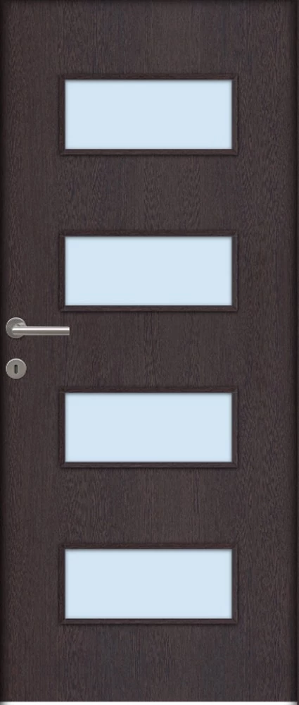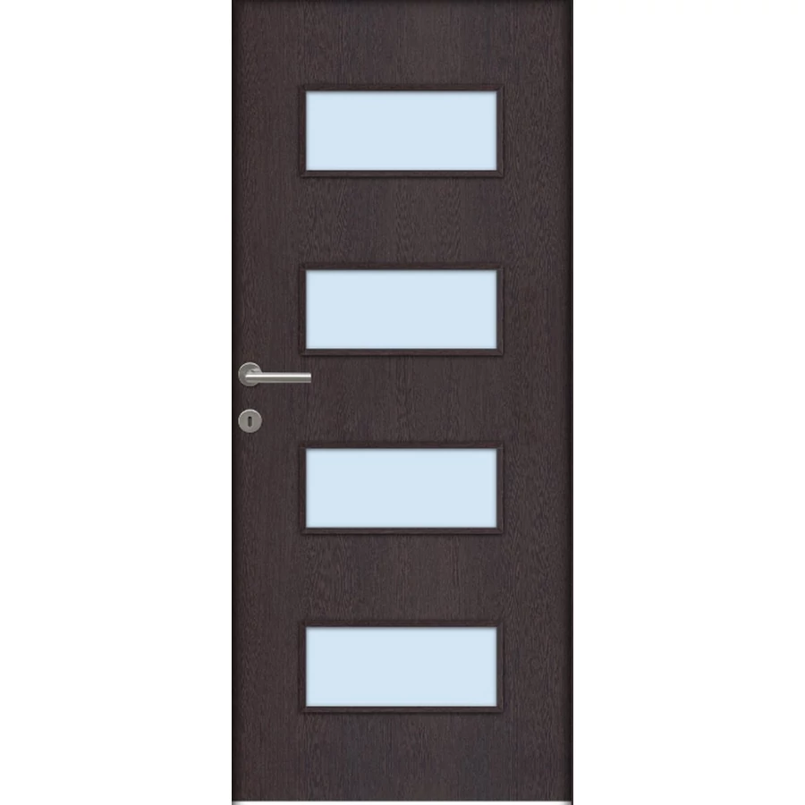 A Missouri savmart üveges ajtó ára nem tartalmazza a tokot, küszöböt és kilincset. A hozzá való tokot fal vastagságtól függően külön kell hozzá kiválasztani, mert a falvastagsághoz méreten különböző áron értékesítjük. A kilincset szintén külön kell kiválasztani, mert többféle tipusból lehet választani és tipusonként eltérnek az árai. Nyitásmódja: egyszárnyú nyíló, nyitásiránya jobbos ( a zsanéros oldal felől nézve, a zsanér a jobb oldalon helyezkedik el ). Tényleges tokmagkülmérete: 72 cm széles 208 cm magas. Színe: wenge. Könnyített szerkezetű falcos kialakítású 40mm vastag beltéri ajtólap. Szerkezeti felépítése : MDF vagy faforgácslap keret kétoldali dekorfóliás felületű HDF lemez borítással. Csak papírrács térkitöltéssel rendelhető függőleges száliránnyal.Az utólag szerelhető dekorfóliával burkolt ajtók költséghatékony megoldást kínálnak. Nyomtatott mintázatuk élethűen jeleníti meg a fa erezetét. A dekor felület nyomtatott famintázatot jelent HDF hordozó felületre ragasztva A fóliás ajtók egyik legnagyobb előnye, hogy: utókezelést nem igényel, már csak használnia kell! A borító felülete egy dekor fólia, ami savra keményedő, közepesen strapabíró védőlakk borítást kap. Szép, tartós ajtó, olyan helyekre ajánljuk, ahol kisebb igénybevételnek lesz kitéve. A szabvány dekor beltéri ajtó átlagos, beltéri használat során tökéletesen megállja a helyét, költséghatékony megoldást jelent a családi házak esetében ahol a korlátozottabb számú szín és mintázat másodlagos tényező. A dekorfóliás beltéri ajtók ára nem tartalmazza a küszöböt és a kilincset. A dekorfóliás ajtókra a kilincset üzletünkben megvásárolhatja, illetve rendelés esetén számtalan kilincs közül válogathat.