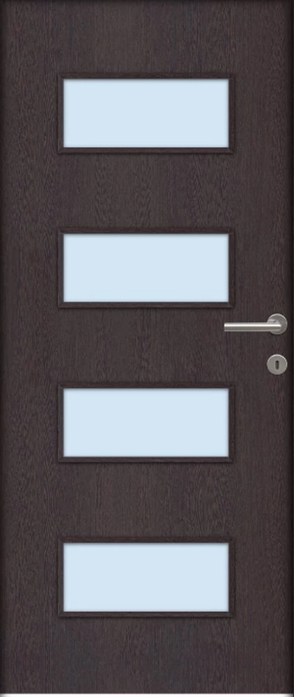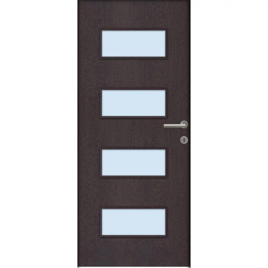 A Missouri savmart üveges ajtó ára nem tartalmazza a tokot, küszöböt és kilincset. A hozzá való tokot fal vastagságtól függően külön kell hozzá kiválasztani, mert a falvastagsághoz méreten különböző áron értékesítjük. A kilincset szintén külön kell kiválasztani, mert többféle tipusból lehet választani és tipusonként eltérnek az árai. Nyitásmódja: egyszárnyú nyíló, nyitásiránya balos ( a zsanéros oldal felől nézve, a zsanér a bal oldalon helyezkedik el ). Tényleges tokmagkülmérete: 86 cm széles 208 cm magas. Színe: wenge. Könnyített szerkezetű falcos kialakítású 40mm vastag beltéri ajtólap. Szerkezeti felépítése : MDF vagy faforgácslap keret kétoldali dekorfóliás felületű HDF lemez borítással. Csak papírrács térkitöltéssel rendelhető függőleges száliránnyal.Az utólag szerelhető dekorfóliával burkolt ajtók költséghatékony megoldást kínálnak. Nyomtatott mintázatuk élethűen jeleníti meg a fa erezetét. A dekor felület nyomtatott famintázatot jelent HDF hordozó felületre ragasztva A fóliás ajtók egyik legnagyobb előnye, hogy: utókezelést nem igényel, már csak használnia kell! A borító felülete egy dekor fólia, ami savra keményedő, közepesen strapabíró védőlakk borítást kap. Szép, tartós ajtó, olyan helyekre ajánljuk, ahol kisebb igénybevételnek lesz kitéve. A szabvány dekor beltéri ajtó átlagos, beltéri használat során tökéletesen megállja a helyét, költséghatékony megoldást jelent a családi házak esetében ahol a korlátozottabb számú szín és mintázat másodlagos tényező. A dekorfóliás beltéri ajtók ára nem tartalmazza a küszöböt és a kilincset. A dekorfóliás ajtókra a kilincset üzletünkben megvásárolhatja, illetve rendelés esetén számtalan kilincs közül válogathat.