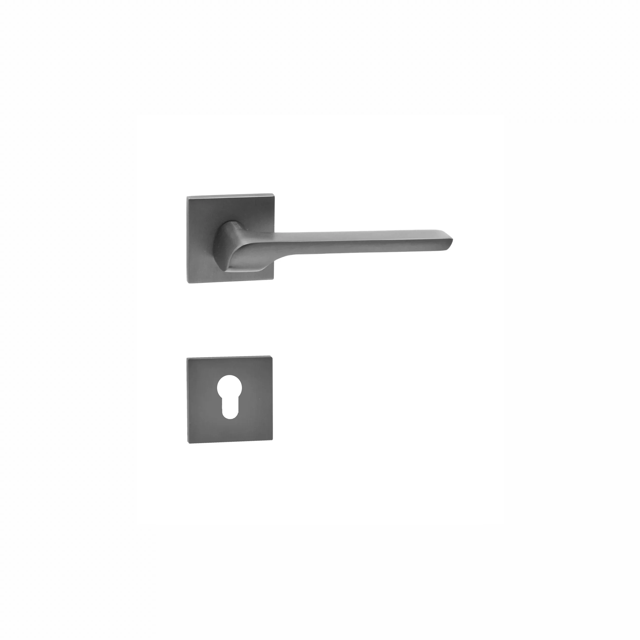 Cilinderzárbetétes antracit beltéri ajtókilincs. Modern formavilágú letisztult kilincs. Négyzetrozettás.