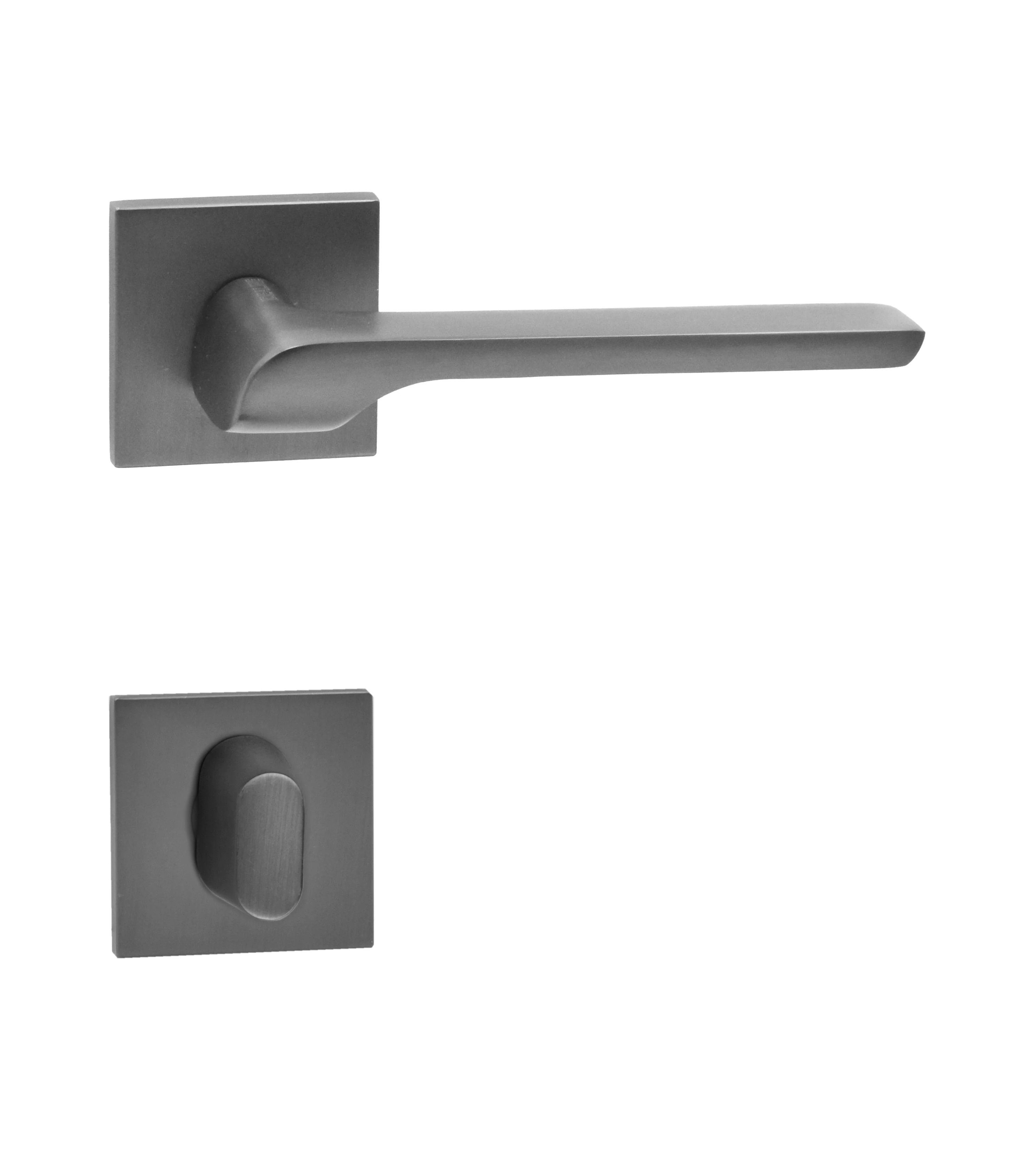 Fordítógombos ( WC záras ) antracit beltéri ajtókilincs. Modern formavilágú letisztult kilincs. Négyzetrozettás.