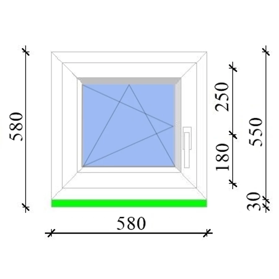 Kiváló hőszigetelésű műanyag ablak 5 kamrás Salamander profilból, 73 mm beépítési mélységgel, tokban és szárnyban is körbefutó idomacél merevítéssel. Vasalata Német Siegenia tipusú. Dupla szürke ütközőtömítéssel rendelkezik. Üvegezése víztiszta 3 rétegű Szuperlágybevonatos thermo üveg, 40 mm vastagságban, UG értéke: 0.6 W/m2K . Az ablak mindkét oldalán fehér színű. Nyitásmódja bukó nyíló, nyitásiránya balos ( bentről nézve a zsanér a bal oldalon helyezkedik el ). Tényleges tokkülmérete: 58 cm széles 58 cm magas a magassága méreten belűl tartalmaz egy párkány fogadására alkalmas profilt, amely szükség esetén lecsavarozható.