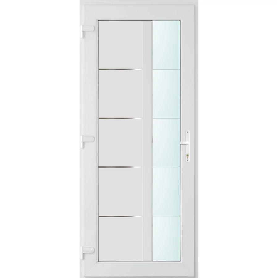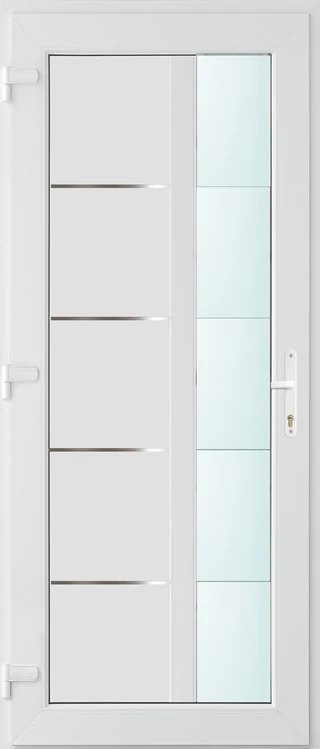 Kiváló hőszigetelésű műanyag bejárati ajtó 5 kamrás profilból, 70 mm beépítési mélységgel, tokban körbefutó idomacél merevítéssel. Vasalat: kilincsműködtetésű, VORNE 5 pontos ajtózárral, 3 db 3D erősített ajtópánttal, 20mm magas hőhídmentes alumínium küszöbbel. Dupla szürke ütközőtömítéssel rendelkezik. Üvegezése "SAVMART" katedrál 2 rétegű Szuperlágybevonatos thermo üveg, 24 mm vastagságban, UG értéke: 1.0 W/m2K . A bejárati ajtó mindkét oldalán fehér színű. Nyitásmódja befelé nyíló, nyitásiránya balos ( bentről nézve a zsanér a bal oldalon helyezkedik el ). Tényleges tokkülmérete: 98 cm széles 208 cm magas A nyílászáró ára nem tartalmazza a KILINCSET és a ZÁRBETÉTET a beszereléshez szükséges segédanyagokat (falkampó, csavar, pur-hab..stb.), külső-belső takaróléceket.