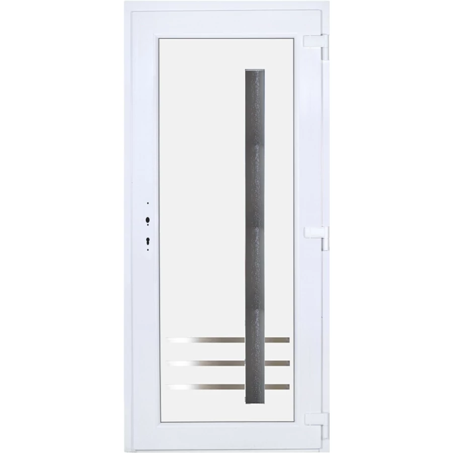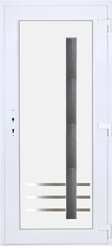 Kiváló hőszigetelésű műanyag bejárati ajtó 5 kamrás profilból, 70 mm beépítési mélységgel, tokban körbefutó idomacél merevítéssel. Vasalat: kilincsműködtetésű, 5 pontos ajtózárral, 3 db 3D erősített ajtópánttal, 35mm magas hőhídmentes alumínium küszöbbel. Dupla szürke ütközőtömítéssel rendelkezik. Üvegezése "GRÍZ" katedrál 2 rétegű Szuperlágybevonatos thermo üveg, 24 mm vastagságban, UG értéke: 1.0 W/m2K . A bejárati ajtó mindkét oldalán fehér színű. Nyitásmódja befelé nyíló, nyitásiránya jobbos ( bentről nézve a zsanér a jobb oldalon helyezkedik el ). Tényleges tokkülmérete: 98 cm széles 208,5 cm magas A nyílászáró ára nem tartalmazza a KILINCSET és a ZÁRBETÉTET a beszereléshez szükséges segédanyagokat (falkampó, csavar, pur-hab..stb.), külső-belső takaróléceket.