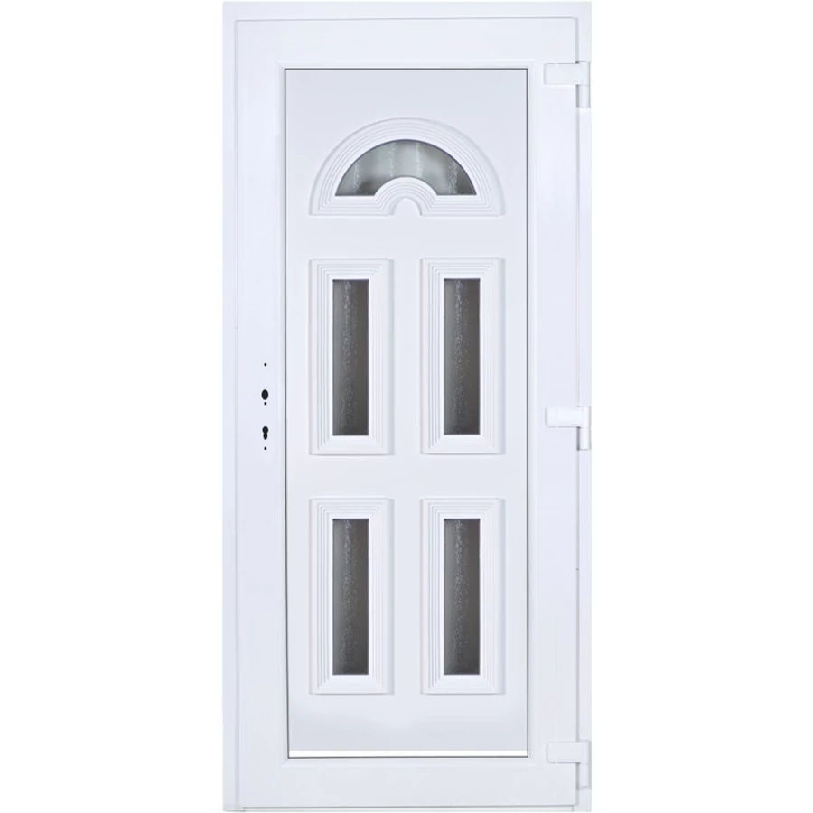 EXTRA hőszigetelésű műanyag bejárati ajtó 5 kamrás profilból, 70 mm beépítési mélységgel, tokban körbefutó idomacél merevítéssel. Vasalat: kilincsműködtetésű, 5 pontos ajtózárral, 3 db 3D erősített ajtópánttal, 20mm magas hőhídmentes alumínium küszöbbel, + 20mm purenittel a küszöb alatt. Dupla szürke ütközőtömítéssel rendelkezik. Üvegezése "savmart" katedrál 3 RÉTEGŰ Szuperlágybevonatos thermo üveg, 42 mm vastagságban, UG értéke: 0,7 W/m2K . A bejárati ajtó mindkét oldalán fehér színű. Nyitásmódja befelé nyíló, nyitásiránya jobbos ( bentről nézve a zsanér a jobb oldalon helyezkedik el ). Tényleges tokkülmérete: 98 cm széles 209 cm magas A nyílászáró ára nem tartalmazza a KILINCSET és a ZÁRBETÉTET a beszereléshez szükséges segédanyagokat (falkampó, csavar, pur-hab..stb.), külső-belső takaróléceket.
