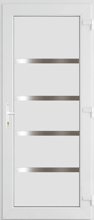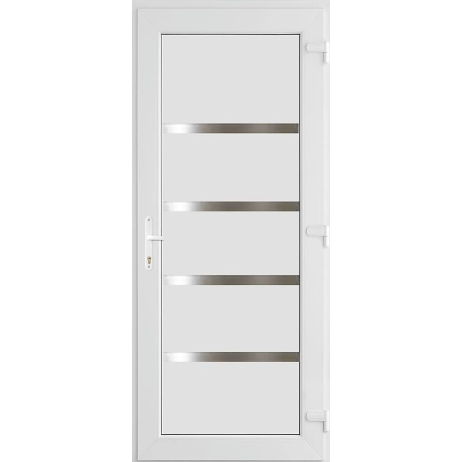 Kiváló hőszigetelésű műanyag bejárati ajtó 5 kamrás Pro line profilból, 70 mm beépítési mélységgel, tokban körbefutó idomacél merevítéssel. Vasalat: kilincsműködtetésű, VORNE 5 pontos ajtózárral, 3 db 3D erősített ajtópánttal, 20mm magas hőhídmentes alumínium küszöbbel. Dupla szürke ütközőtömítéssel rendelkezik. Üvegezése "SAVMART" katedrál 3 rétegű Szuperlágybevonatos thermo üveg, 40 mm vastagságban, UG értéke: 0.7 W/m2K . A bejárati ajtó mindkét oldalán fehér színű. Nyitásmódja befelé nyíló, nyitásiránya jobbos ( bentről nézve a zsanér a bal oldalon helyezkedik el ). Tényleges tokkülmérete: 98 cm széles 208 cm magas A nyílászáró ára nem tartalmazza a KILINCSET és a ZÁRBETÉTET a beszereléshez szükséges segédanyagokat (falkampó, csavar, pur-hab..stb.), külső-belső takaróléceket.