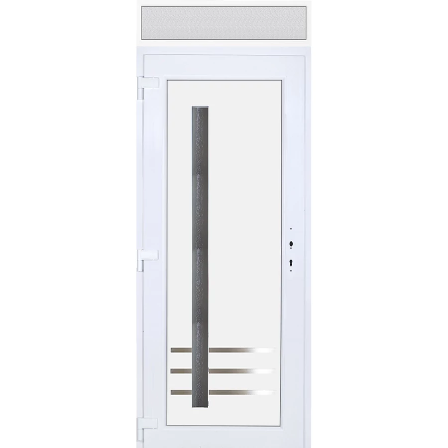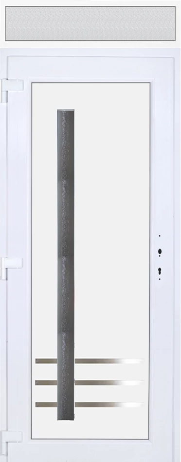 EXTRA hőszigetelésű műanyag bejárati ajtó 5 kamrás profilból, 70 mm beépítési mélységgel, tokban körbefutó idomacél merevítéssel. Vasalat: kilincsműködtetésű, 5 pontos ajtózárral, 3 db 3D erősített ajtópánttal, 20mm magas hőhídmentes alumínium küszöbbel, + 20mm purenittel a küszöb alatt. Dupla szürke ütközőtömítéssel rendelkezik. Üvegezése "savmart" katedrál 3 RÉTEGŰ Szuperlágybevonatos thermo üveg, 42 mm vastagságban, UG értéke: 0,7 W/m2K . A bejárati ajtó mindkét oldalán fehér színű. Nyitásmódja befelé nyíló, nyitásiránya balos ( bentről nézve a zsanér a bal oldalon helyezkedik el ). Tényleges tokkülmérete: 98 cm széles 239 cm magas. 98 cm széles 209 cm magas bejárati ajtóból, 98 cm széles 30 cm magas fix "savmart" üvegezésű ( nem nyitható) felülvilágítóból áll. ( két külön elem ami beépítéskor összeszerelendő). A nyílászáró ára nem tartalmazza a KILINCSET és a ZÁRBETÉTET a beszereléshez szükséges segédanyagokat (falkampó, csavar, pur-hab..stb.), külső-belső takaróléceket.