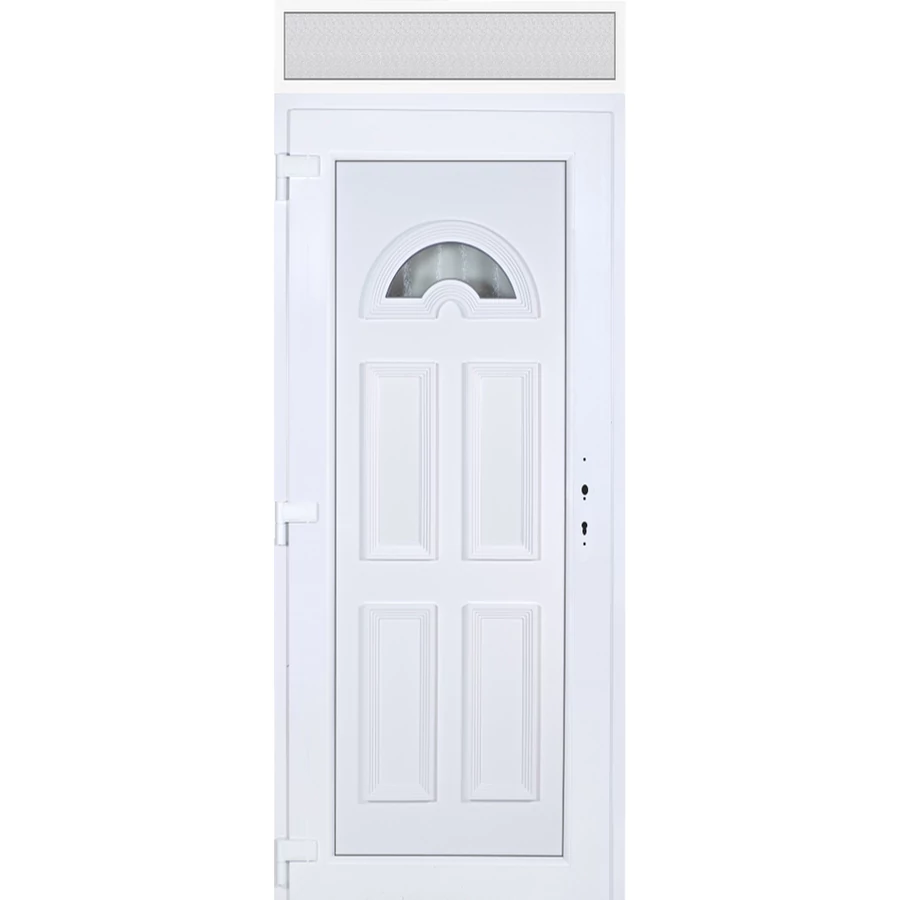 Kiváló hőszigetelésű műanyag bejárati ajtó 5 kamrás profilból, 70 mm beépítési mélységgel, tokban körbefutó idomacél merevítéssel. Vasalat: kilincsműködtetésű, 5 pontos ajtózárral, 3 db 3D erősített ajtópánttal, 35mm magas hőhídmentes alumínium küszöbbel. Dupla szürke ütközőtömítéssel rendelkezik. Üvegezése "GRÍZ" katedrál 2 rétegű Szuperlágybevonatos thermo üveg, 24 mm vastagságban, UG értéke: 1.0 W/m2K . A bejárati ajtó mindkét oldalán fehér színű. Nyitásmódja befelé nyíló, nyitásiránya balos ( bentről nézve a zsanér a bal oldalon helyezkedik el ). Tényleges tokkülmérete: 98 cm széles 238,5 cm magas. 98 cm széles 208,5 cm magas bejárati ajtóból,98 cm széles 30 cm magas fix "GRÍZ" üvegezésű ( nem nyitható) felülvilágítóból áll. ( két külön elem ami beépítéskor összeszerelendő). A nyílászáró ára nem tartalmazza a KILINCSET és a ZÁRBETÉTET a beszereléshez szükséges segédanyagokat (falkampó, csavar, pur-hab..stb.), külső-belső takaróléceket.