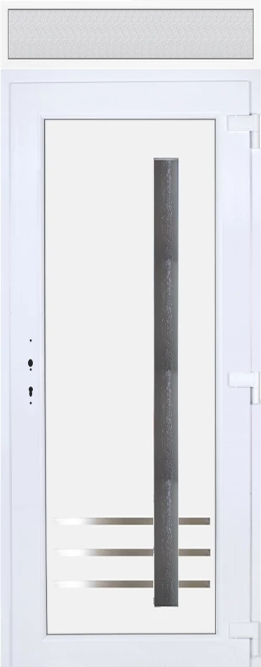 EXTRA hőszigetelésű műanyag bejárati ajtó 5 kamrás profilból, 70 mm beépítési mélységgel, tokban körbefutó idomacél merevítéssel. Vasalat: kilincsműködtetésű, 5 pontos ajtózárral, 3 db 3D erősített ajtópánttal, 20mm magas hőhídmentes alumínium küszöbbel, + 20mm purenittel a küszöb alatt. Dupla szürke ütközőtömítéssel rendelkezik. Üvegezése "savmart" katedrál 3 RÉTEGŰ Szuperlágybevonatos thermo üveg, 42 mm vastagságban, UG értéke: 0,7 W/m2K . A bejárati ajtó mindkét oldalán fehér színű. Nyitásmódja befelé nyíló, nyitásiránya jobbos ( bentről nézve a zsanér a jobb oldalon helyezkedik el ). Tényleges tokkülmérete: 98 cm széles 239 cm magas. 98 cm széles 209 cm magas bejárati ajtóból, 98 cm széles 30 cm magas fix "savmart" üvegezésű ( nem nyitható) felülvilágítóból áll. ( két külön elem ami beépítéskor összeszerelendő). A nyílászáró ára nem tartalmazza a KILINCSET és a ZÁRBETÉTET a beszereléshez szükséges segédanyagokat (falkampó, csavar, pur-hab..stb.), külső-belső takaróléceket.
