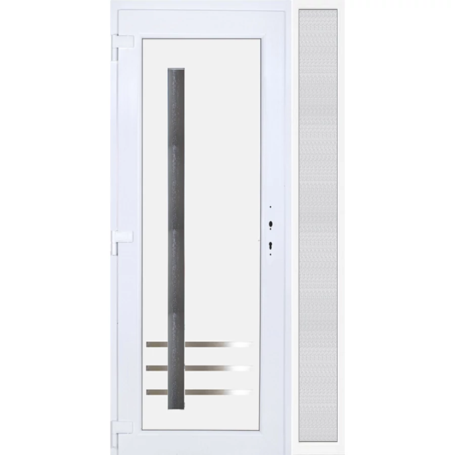 EXTRA hőszigetelésű műanyag bejárati ajtó 5 kamrás profilból, 70 mm beépítési mélységgel, tokban körbefutó idomacél merevítéssel. Vasalat: kilincsműködtetésű, 5 pontos ajtózárral, 3 db 3D erősített ajtópánttal, 20mm magas hőhídmentes alumínium küszöbbel, + 20mm purenittel a küszöb alatt. Dupla szürke ütközőtömítéssel rendelkezik. Üvegezése "savmart" katedrál 3 RÉTEGŰ Szuperlágybevonatos thermo üveg, 42 mm vastagságban, UG értéke: 0,7 W/m2K . A bejárati ajtó mindkét oldalán fehér színű. Nyitásmódja befelé nyíló, nyitásiránya balos ( bentről nézve a zsanér a bal oldalon helyezkedik el ). Tényleges tokkülmérete: 118 cm széles 209 cm magas. 88 cm széles 209 cm magas bejárati ajtóból,30 cm széles 209 cm magas fix "savmart" üvegezésű ( nem nyitható) oldalvilágítóból áll. ( két külön elem ami beépítéskor összeszerelendő). A nyílászáró ára nem tartalmazza a KILINCSET és a ZÁRBETÉTET a beszereléshez szükséges segédanyagokat (falkampó, csavar, pur-hab..stb.), külső-belső takaróléceket.