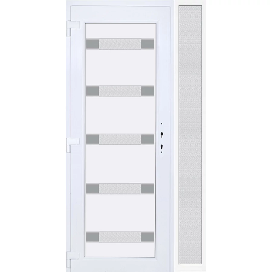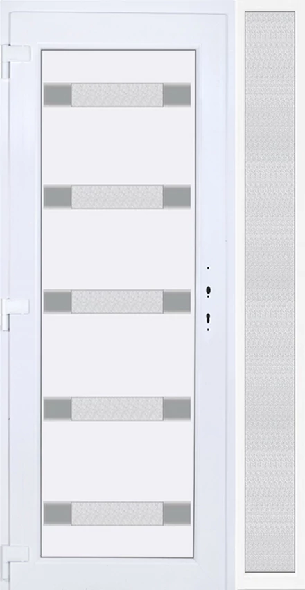 Kiváló hőszigetelésű műanyag bejárati ajtó 5 kamrás profilból, 70 mm beépítési mélységgel, tokban körbefutó idomacél merevítéssel. Vasalat: kilincsműködtetésű, 5 pontos ajtózárral, 3 db 3D erősített ajtópánttal, 35mm magas hőhídmentes alumínium küszöbbel. Dupla szürke ütközőtömítéssel rendelkezik. Üvegezése "GRÍZ" katedrál 2 rétegű Szuperlágybevonatos thermo üveg, 24 mm vastagságban, UG értéke: 1.0 W/m2K . A bejárati ajtó mindkét oldalán fehér színű. Nyitásmódja befelé nyíló, nyitásiránya balos ( bentről nézve a zsanér a bal oldalon helyezkedik el ). Tényleges tokkülmérete: 118 cm széles 208,5 cm magas. 88 cm széles 208,5 cm magas bejárati ajtóból,30 cm széles 208,5 cm magas fix "GRÍZ" üvegezésű ( nem nyitható) oldalvilágítóból áll. ( két külön elem ami beépítéskor összeszerelendő). A nyílászáró ára nem tartalmazza a KILINCSET és a ZÁRBETÉTET a beszereléshez szükséges segédanyagokat (falkampó, csavar, pur-hab..stb.), külső-belső takaróléceket.