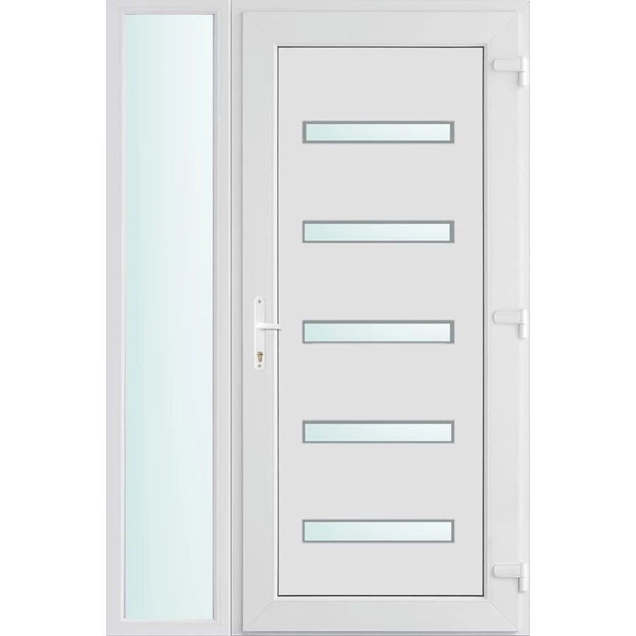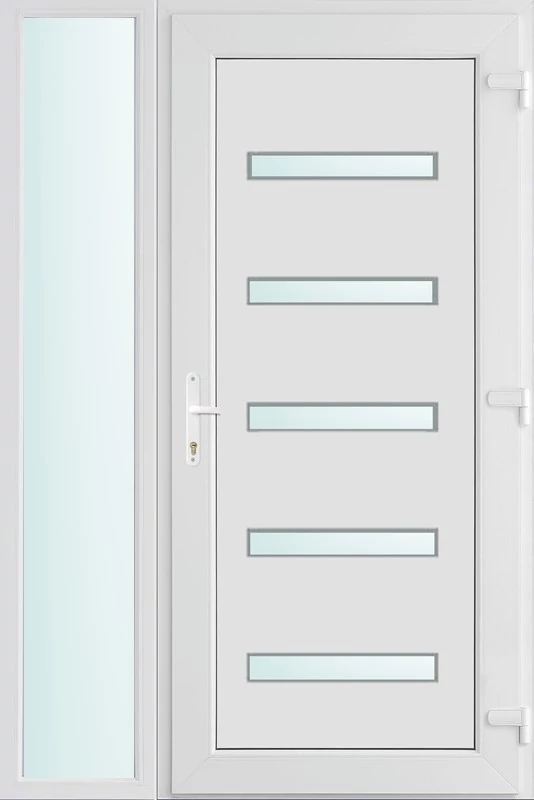 Kiváló hőszigetelésű műanyag bejárati ajtó 5 kamrás profilból, 70 mm beépítési mélységgel, tokban körbefutó idomacél merevítéssel. Vasalat: kilincsműködtetésű, VORNE 5 pontos ajtózárral, 3 db 3D erősített ajtópánttal, 20mm magas hőhídmentes alumínium küszöbbel. Dupla szürke ütközőtömítéssel rendelkezik. Üvegezése "SAVMART" katedrál 2 rétegű Szuperlágybevonatos thermo üveg, 24 mm vastagságban, UG értéke: 1.0 W/m2K . A bejárati ajtó mindkét oldalán fehér színű. Nyitásmódja befelé nyíló, nyitásiránya jobbos ( bentről nézve a zsanér a jobb oldalon helyezkedik el ). Tényleges tokkülmérete: 118 cm széles 208 cm magas. 88 cm széles 208 cm magas bejárati ajtóból,30 cm széles 208 cm magas fix "SAVMART" üvegezésű ( nem nyitható) oldalvilágítóból áll. ( két külön elem ami beépítéskor összeszerelendő). A nyílászáró ára nem tartalmazza a KILINCSET és a ZÁRBETÉTET a beszereléshez szükséges segédanyagokat (falkampó, csavar, pur-hab..stb.), külső-belső takaróléceket.