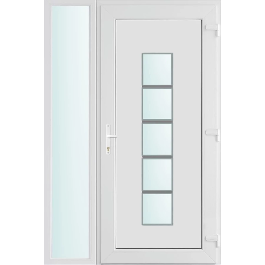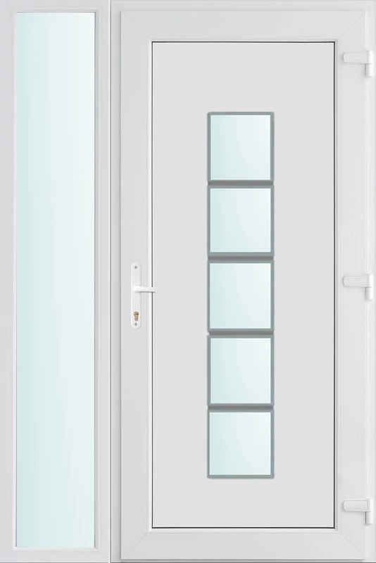 Kiváló hőszigetelésű műanyag bejárati ajtó 5 kamrás profilból, 70 mm beépítési mélységgel, tokban körbefutó idomacél merevítéssel. Vasalat: kilincsműködtetésű, VORNE 5 pontos ajtózárral, 3 db 3D erősített ajtópánttal, 20mm magas hőhídmentes alumínium küszöbbel. Dupla szürke ütközőtömítéssel rendelkezik. Üvegezése "SAVMART" katedrál 2 rétegű Szuperlágybevonatos thermo üveg, 24 mm vastagságban, UG értéke: 1.0 W/m2K . A bejárati ajtó mindkét oldalán fehér színű. Nyitásmódja befelé nyíló, nyitásiránya jobbos ( bentről nézve a zsanér a jobb oldalon helyezkedik el ). Tényleges tokkülmérete: 118 cm széles 208 cm magas. 88 cm széles 208 cm magas bejárati ajtóból,30 cm széles 208 cm magas fix "SAVMART" üvegezésű ( nem nyitható) oldalvilágítóból áll. ( két külön elem ami beépítéskor összeszerelendő). A nyílászáró ára nem tartalmazza a KILINCSET és a ZÁRBETÉTET a beszereléshez szükséges segédanyagokat (falkampó, csavar, pur-hab..stb.), külső-belső takaróléceket.