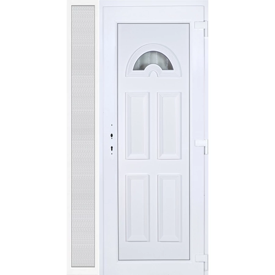 EXTRA hőszigetelésű műanyag bejárati ajtó 5 kamrás profilból, 70 mm beépítési mélységgel, tokban körbefutó idomacél merevítéssel. Vasalat: kilincsműködtetésű, 5 pontos ajtózárral, 3 db 3D erősített ajtópánttal, 20mm magas hőhídmentes alumínium küszöbbel, + 20mm purenittel a küszöb alatt. Dupla szürke ütközőtömítéssel rendelkezik. Üvegezése "savmart" katedrál 3 RÉTEGŰ Szuperlágybevonatos thermo üveg, 42 mm vastagságban, UG értéke: 0,7 W/m2K . A bejárati ajtó mindkét oldalán fehér színű. Nyitásmódja befelé nyíló, nyitásiránya jobbos ( bentről nézve a zsanér a jobb oldalon helyezkedik el ). Tényleges tokkülmérete: 118 cm széles 209 cm magas. 88 cm széles 209 cm magas bejárati ajtóból,30 cm széles 209 cm magas fix "savmart" üvegezésű ( nem nyitható) oldalvilágítóból áll. ( két külön elem ami beépítéskor összeszerelendő). A nyílászáró ára nem tartalmazza a KILINCSET és a ZÁRBETÉTET a beszereléshez szükséges segédanyagokat (falkampó, csavar, pur-hab..stb.), külső-belső takaróléceket.