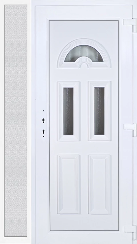 EXTRA hőszigetelésű műanyag bejárati ajtó 5 kamrás profilból, 70 mm beépítési mélységgel, tokban körbefutó idomacél merevítéssel. Vasalat: kilincsműködtetésű, 5 pontos ajtózárral, 3 db 3D erősített ajtópánttal, 20mm magas hőhídmentes alumínium küszöbbel, + 20mm purenittel a küszöb alatt. Dupla szürke ütközőtömítéssel rendelkezik. Üvegezése "savmart" katedrál 3 RÉTEGŰ Szuperlágybevonatos thermo üveg, 42 mm vastagságban, UG értéke: 0,7 W/m2K . A bejárati ajtó mindkét oldalán fehér színű. Nyitásmódja befelé nyíló, nyitásiránya jobbos ( bentről nézve a zsanér a jobb oldalon helyezkedik el ). Tényleges tokkülmérete: 118 cm széles 209 cm magas. 88 cm széles 209 cm magas bejárati ajtóból,30 cm széles 209 cm magas fix "savmart" üvegezésű ( nem nyitható) oldalvilágítóból áll. ( két külön elem ami beépítéskor összeszerelendő). A nyílászáró ára nem tartalmazza a KILINCSET és a ZÁRBETÉTET a beszereléshez szükséges segédanyagokat (falkampó, csavar, pur-hab..stb.), külső-belső takaróléceket.