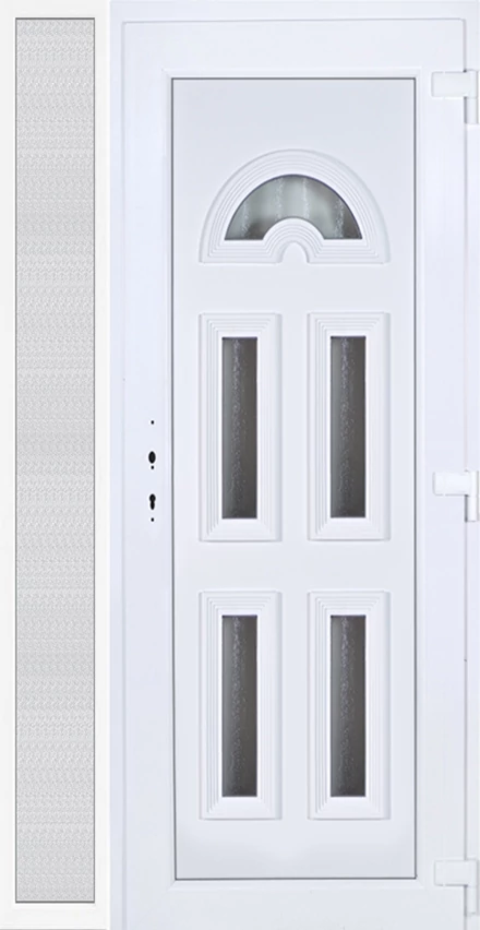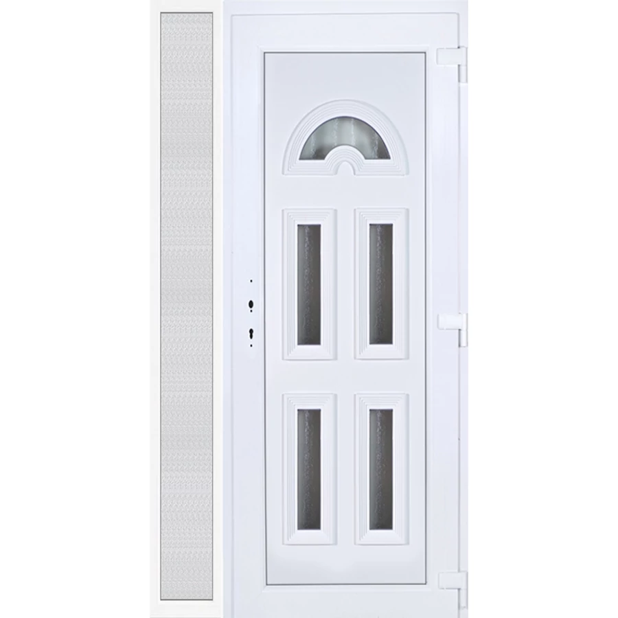 Műanyag bejárati ajtó 120x210 jobbos Miami 5 üveges 3 rétegű üveggel extra vastag hőszigetelt panellal oldalvilágítóval 5 kamrás fehér