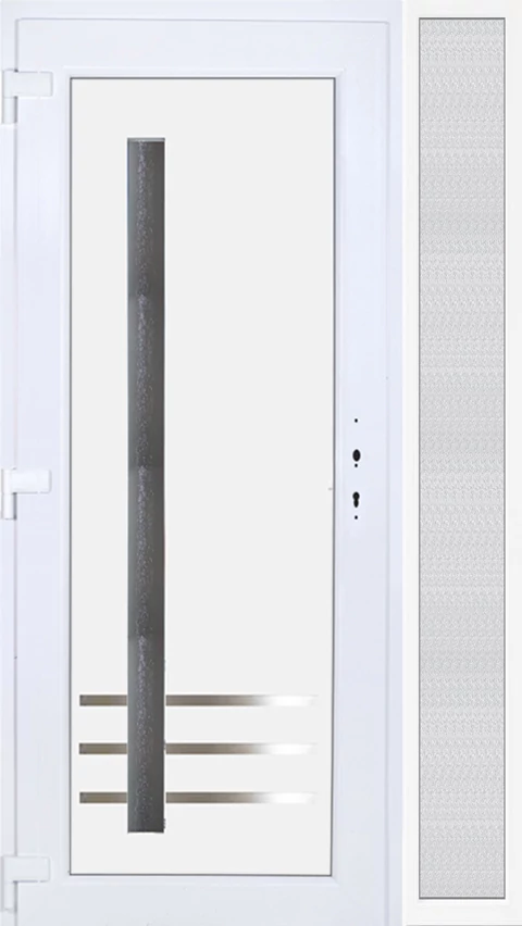 Kiváló hőszigetelésű műanyag bejárati ajtó 5 kamrás profilból, 70 mm beépítési mélységgel, tokban körbefutó idomacél merevítéssel. Vasalat: kilincsműködtetésű, 5 pontos ajtózárral, 3 db 3D erősített ajtópánttal, 35mm magas hőhídmentes alumínium küszöbbel. Dupla szürke ütközőtömítéssel rendelkezik. Üvegezése "GRÍZ" katedrál 2 rétegű Szuperlágybevonatos thermo üveg, 24 mm vastagságban, UG értéke: 1.0 W/m2K . A bejárati ajtó mindkét oldalán fehér színű. Nyitásmódja befelé nyíló, nyitásiránya balos ( bentről nézve a zsanér a bal oldalon helyezkedik el ). Tényleges tokkülmérete: 128 cm széles 208,5 cm magas. 98 cm széles 208,5 cm magas bejárati ajtóból, 30 cm széles 208,5 cm magas fix "GRÍZ" üvegezésű ( nem nyitható) oldalvilágítóból áll. ( két külön elem ami beépítéskor összeszerelendő). A nyílászáró ára nem tartalmazza a KILINCSET és a ZÁRBETÉTET a beszereléshez szükséges segédanyagokat (falkampó, csavar, pur-hab..stb.), külső-belső takaróléceket.