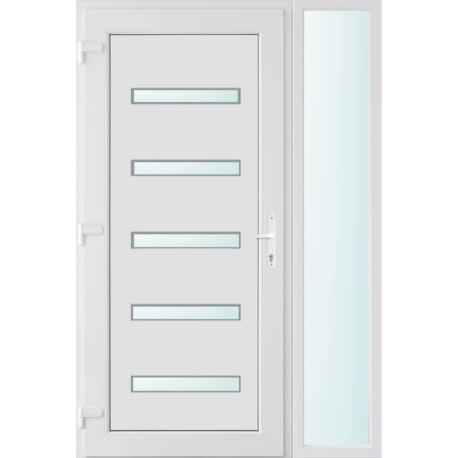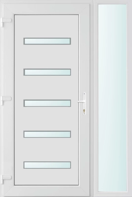 Kiváló hőszigetelésű műanyag bejárati ajtó 5 kamrás profilból, 70 mm beépítési mélységgel, tokban körbefutó idomacél merevítéssel. Vasalat: kilincsműködtetésű, VORNE 5 pontos ajtózárral, 3 db 3D erősített ajtópánttal, 20mm magas hőhídmentes alumínium küszöbbel. Dupla szürke ütközőtömítéssel rendelkezik. Üvegezése "SAVMART" katedrál 2 rétegű Szuperlágybevonatos thermo üveg, 24 mm vastagságban, UG értéke: 1.0 W/m2K . A bejárati ajtó mindkét oldalán fehér színű. Nyitásmódja befelé nyíló, nyitásiránya balos ( bentről nézve a zsanér a bal oldalon helyezkedik el ). Tényleges tokkülmérete: 128 cm széles 208 cm magas. 98 cm széles 208 cm magas bejárati ajtóból, 30 cm széles 208 cm magas fix "SAVMART" üvegezésű ( nem nyitható) oldalvilágítóból áll. ( két külön elem ami beépítéskor összeszerelendő). A nyílászáró ára nem tartalmazza a KILINCSET és a ZÁRBETÉTET a beszereléshez szükséges segédanyagokat (falkampó, csavar, pur-hab..stb.), külső-belső takaróléceket.