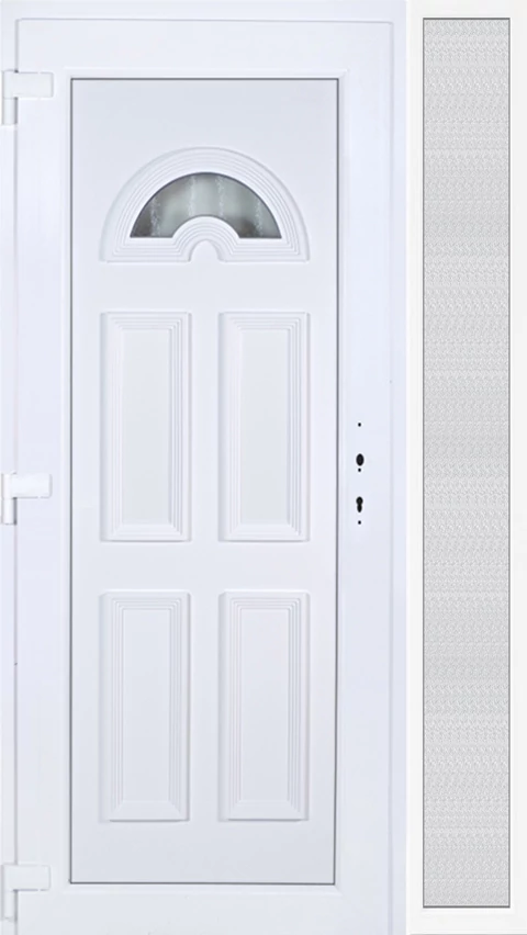 EXTRA hőszigetelésű műanyag bejárati ajtó 5 kamrás profilból, 70 mm beépítési mélységgel, tokban körbefutó idomacél merevítéssel. Vasalat: kilincsműködtetésű, 5 pontos ajtózárral, 3 db 3D erősített ajtópánttal, 20mm magas hőhídmentes alumínium küszöbbel, + 20mm purenittel a küszöb alatt. Dupla szürke ütközőtömítéssel rendelkezik. Üvegezése "savmart" katedrál 3 RÉTEGŰ Szuperlágybevonatos thermo üveg, 42 mm vastagságban, UG értéke: 0,7 W/m2K . A bejárati ajtó mindkét oldalán fehér színű. Nyitásmódja befelé nyíló, nyitásiránya balos ( bentről nézve a zsanér a bal oldalon helyezkedik el ). Tényleges tokkülmérete: 128 cm széles 209 cm magas. 98 cm széles 209 cm magas bejárati ajtóból, 30 cm széles 209 cm magas fix "savmart" üvegezésű ( nem nyitható) oldalvilágítóból áll. ( két külön elem ami beépítéskor összeszerelendő). A nyílászáró ára nem tartalmazza a KILINCSET és a ZÁRBETÉTET a beszereléshez szükséges segédanyagokat (falkampó, csavar, pur-hab..stb.), külső-belső takaróléceket.