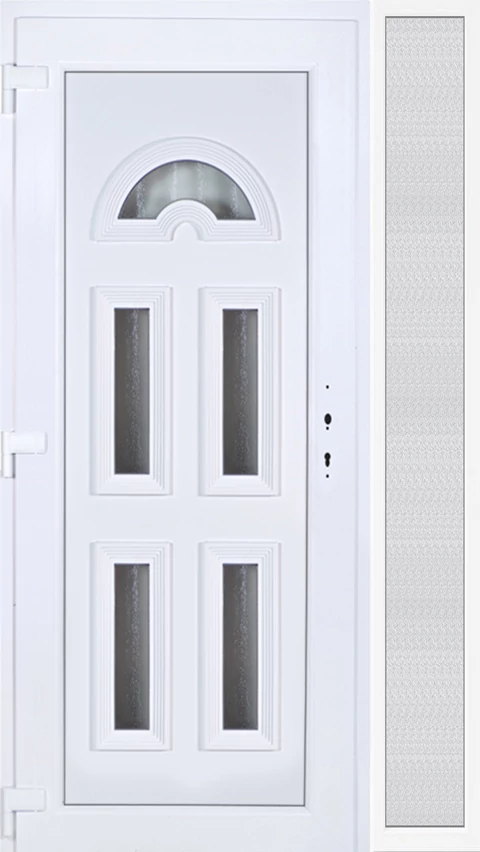 Kiváló hőszigetelésű műanyag bejárati ajtó 5 kamrás profilból, 70 mm beépítési mélységgel, tokban körbefutó idomacél merevítéssel. Vasalat: kilincsműködtetésű, 5 pontos ajtózárral, 3 db 3D erősített ajtópánttal, 35mm magas hőhídmentes alumínium küszöbbel. Dupla szürke ütközőtömítéssel rendelkezik. Üvegezése "GRÍZ" katedrál 2 rétegű Szuperlágybevonatos thermo üveg, 24 mm vastagságban, UG értéke: 1.0 W/m2K . A bejárati ajtó mindkét oldalán fehér színű. Nyitásmódja befelé nyíló, nyitásiránya balos ( bentről nézve a zsanér a bal oldalon helyezkedik el ). Tényleges tokkülmérete: 128 cm széles 208,5 cm magas. 98 cm széles 208,5 cm magas bejárati ajtóból, 30 cm széles 208,5 cm magas fix "GRÍZ" üvegezésű ( nem nyitható) oldalvilágítóból áll. ( két külön elem ami beépítéskor összeszerelendő). A nyílászáró ára nem tartalmazza a KILINCSET és a ZÁRBETÉTET a beszereléshez szükséges segédanyagokat (falkampó, csavar, pur-hab..stb.), külső-belső takaróléceket.
