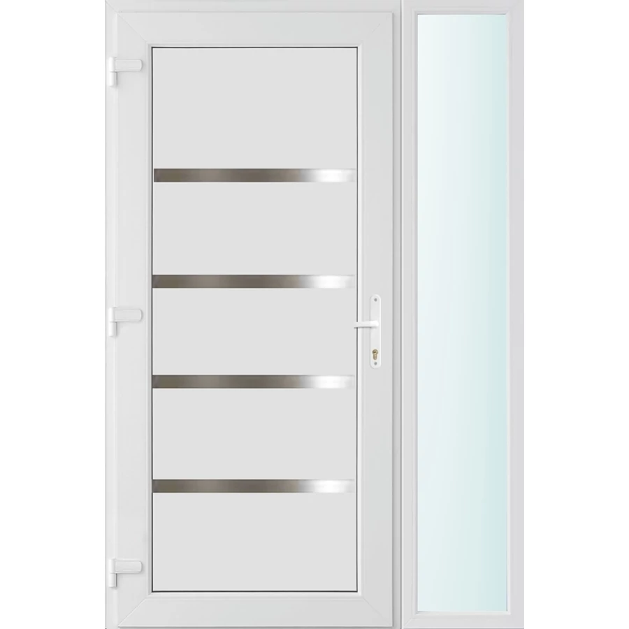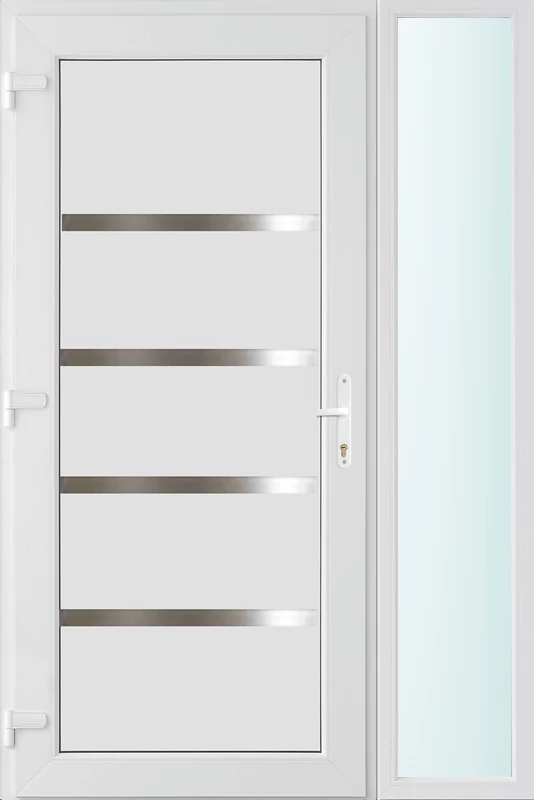 Kiváló hőszigetelésű műanyag bejárati ajtó 5 kamrás Pro line profilból, 70 mm beépítési mélységgel, tokban körbefutó idomacél merevítéssel. Vasalat: kilincsműködtetésű, VORNE 5 pontos ajtózárral, 3 db 3D erősített ajtópánttal, 20mm magas hőhídmentes alumínium küszöbbel. Dupla szürke ütközőtömítéssel rendelkezik. Üvegezése "SAVMART" katedrál 3 rétegű Szuperlágybevonatos thermo üveg, 40 mm vastagságban, UG értéke: 0.7 W/m2K . A bejárati ajtó mindkét oldalán fehér színű. Nyitásmódja befelé nyíló, nyitásiránya balos ( bentről nézve a zsanér a bal oldalon helyezkedik el ). Tényleges tokkülmérete: 128 cm széles 208 cm magas A nyílászáró ára nem tartalmazza a KILINCSET és a ZÁRBETÉTET a beszereléshez szükséges segédanyagokat (falkampó, csavar, pur-hab..stb.), külső-belső takaróléceket.