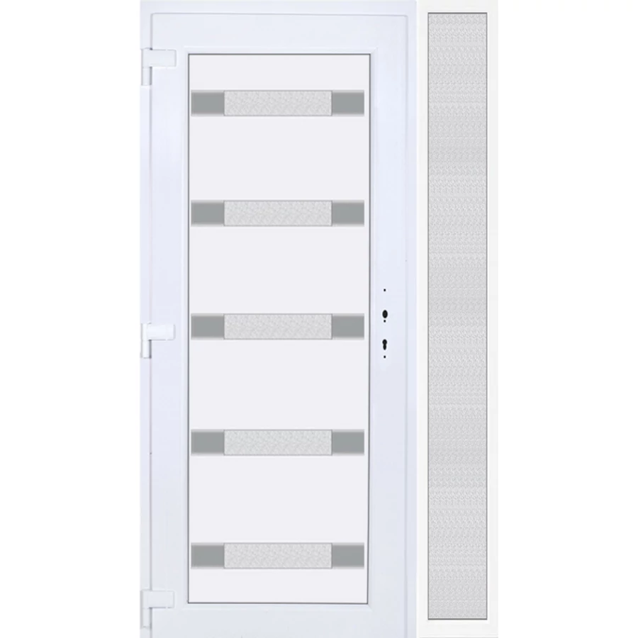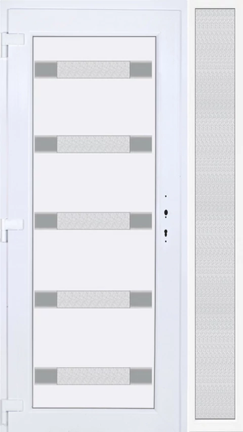 Kiváló hőszigetelésű műanyag bejárati ajtó 5 kamrás profilból, 70 mm beépítési mélységgel, tokban körbefutó idomacél merevítéssel. Vasalat: kilincsműködtetésű, 5 pontos ajtózárral, 3 db 3D erősített ajtópánttal, 35mm magas hőhídmentes alumínium küszöbbel. Dupla szürke ütközőtömítéssel rendelkezik. Üvegezése "GRÍZ" katedrál 2 rétegű Szuperlágybevonatos thermo üveg, 24 mm vastagságban, UG értéke: 1.0 W/m2K . A bejárati ajtó mindkét oldalán fehér színű. Nyitásmódja befelé nyíló, nyitásiránya balos ( bentről nézve a zsanér a bal oldalon helyezkedik el ). Tényleges tokkülmérete: 128 cm széles 208,5 cm magas. 98 cm széles 208,5 cm magas bejárati ajtóból, 30 cm széles 208,5 cm magas fix "GRÍZ" üvegezésű ( nem nyitható) oldalvilágítóból áll. ( két külön elem ami beépítéskor összeszerelendő). A nyílászáró ára nem tartalmazza a KILINCSET és a ZÁRBETÉTET a beszereléshez szükséges segédanyagokat (falkampó, csavar, pur-hab..stb.), külső-belső takaróléceket.