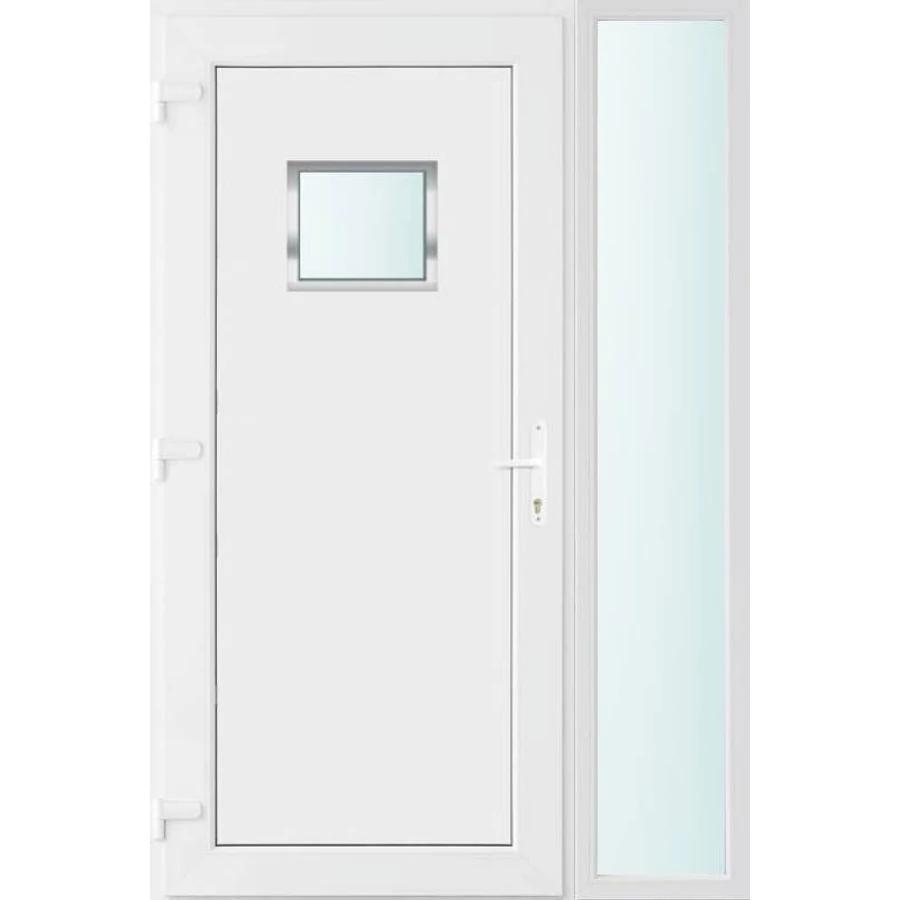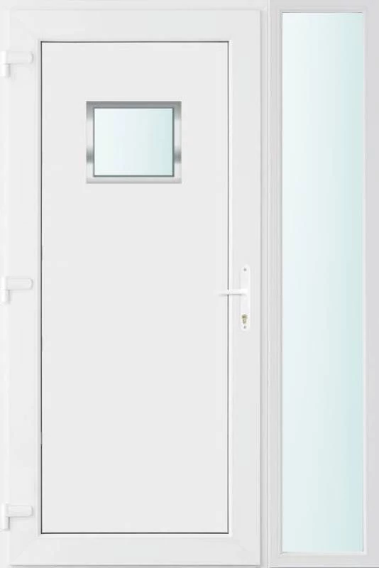 Kiváló hőszigetelésű műanyag bejárati ajtó 5 kamrás profilból, 70 mm beépítési mélységgel, tokban körbefutó idomacél merevítéssel. Vasalat: kilincsműködtetésű, VORNE 5 pontos ajtózárral, 3 db 3D erősített ajtópánttal, 20mm magas hőhídmentes alumínium küszöbbel. Dupla szürke ütközőtömítéssel rendelkezik. Üvegezése "SAVMART" katedrál 2 rétegű Szuperlágybevonatos thermo üveg, 24 mm vastagságban, UG értéke: 1.0 W/m2K . A bejárati ajtó mindkét oldalán fehér színű. Nyitásmódja befelé nyíló, nyitásiránya balos ( bentről nézve a zsanér a bal oldalon helyezkedik el ). Tényleges tokkülmérete: 128 cm széles 208 cm magas. 98 cm széles 208 cm magas bejárati ajtóból, 30 cm széles 208 cm magas fix "SAVMART" üvegezésű ( nem nyitható) oldalvilágítóból áll. ( két külön elem ami beépítéskor összeszerelendő). A nyílászáró ára nem tartalmazza a KILINCSET és a ZÁRBETÉTET a beszereléshez szükséges segédanyagokat (falkampó, csavar, pur-hab..stb.), külső-belső takaróléceket.