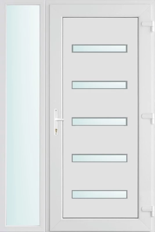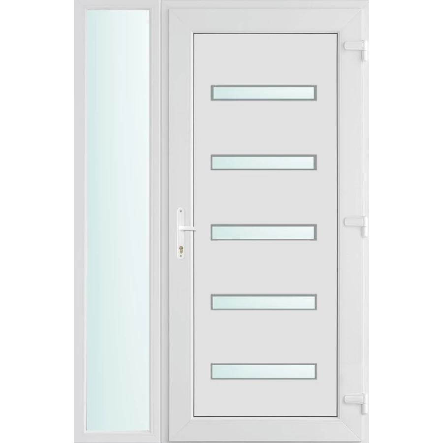 Kiváló hőszigetelésű műanyag bejárati ajtó 5 kamrás profilból, 70 mm beépítési mélységgel, tokban körbefutó idomacél merevítéssel. Vasalat: kilincsműködtetésű, VORNE 5 pontos ajtózárral, 3 db 3D erősített ajtópánttal, 20mm magas hőhídmentes alumínium küszöbbel. Dupla szürke ütközőtömítéssel rendelkezik. Üvegezése "SAVMART" katedrál 2 rétegű Szuperlágybevonatos thermo üveg, 24 mm vastagságban, UG értéke: 1.0 W/m2K . A bejárati ajtó mindkét oldalán fehér színű. Nyitásmódja befelé nyíló, nyitásiránya jobbos ( bentről nézve a zsanér a jobb oldalon helyezkedik el ). Tényleges tokkülmérete: 128 cm széles 208 cm magas. 98 cm széles 208 cm magas bejárati ajtóból, 30 cm széles 208 cm magas fix "SAVMART" üvegezésű ( nem nyitható) oldalvilágítóból áll. ( két külön elem ami beépítéskor összeszerelendő). A nyílászáró ára nem tartalmazza a KILINCSET és a ZÁRBETÉTET a beszereléshez szükséges segédanyagokat (falkampó, csavar, pur-hab..stb.), külső-belső takaróléceket.