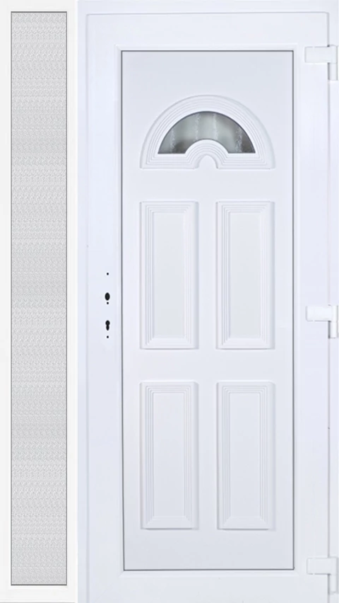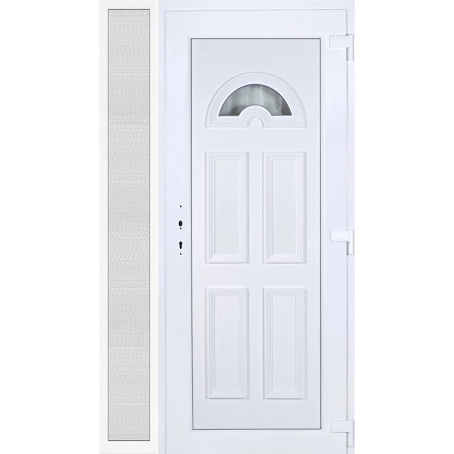 EXTRA hőszigetelésű műanyag bejárati ajtó 5 kamrás profilból, 70 mm beépítési mélységgel, tokban körbefutó idomacél merevítéssel. Vasalat: kilincsműködtetésű, 5 pontos ajtózárral, 3 db 3D erősített ajtópánttal, 20mm magas hőhídmentes alumínium küszöbbel, + 20mm purenittel a küszöb alatt. Dupla szürke ütközőtömítéssel rendelkezik. Üvegezése "savmart" katedrál 3 RÉTEGŰ Szuperlágybevonatos thermo üveg, 42 mm vastagságban, UG értéke: 0,7 W/m2K . A bejárati ajtó mindkét oldalán fehér színű. Nyitásmódja befelé nyíló, nyitásiránya jobbos ( bentről nézve a zsanér a jobb oldalon helyezkedik el ). Tényleges tokkülmérete: 128 cm széles 209 cm magas. 98 cm széles 209 cm magas bejárati ajtóból, 30 cm széles 209 cm magas fix "savmart" üvegezésű ( nem nyitható) oldalvilágítóból áll. ( két külön elem ami beépítéskor összeszerelendő). A nyílászáró ára nem tartalmazza a KILINCSET és a ZÁRBETÉTET a beszereléshez szükséges segédanyagokat (falkampó, csavar, pur-hab..stb.), külső-belső takaróléceket.