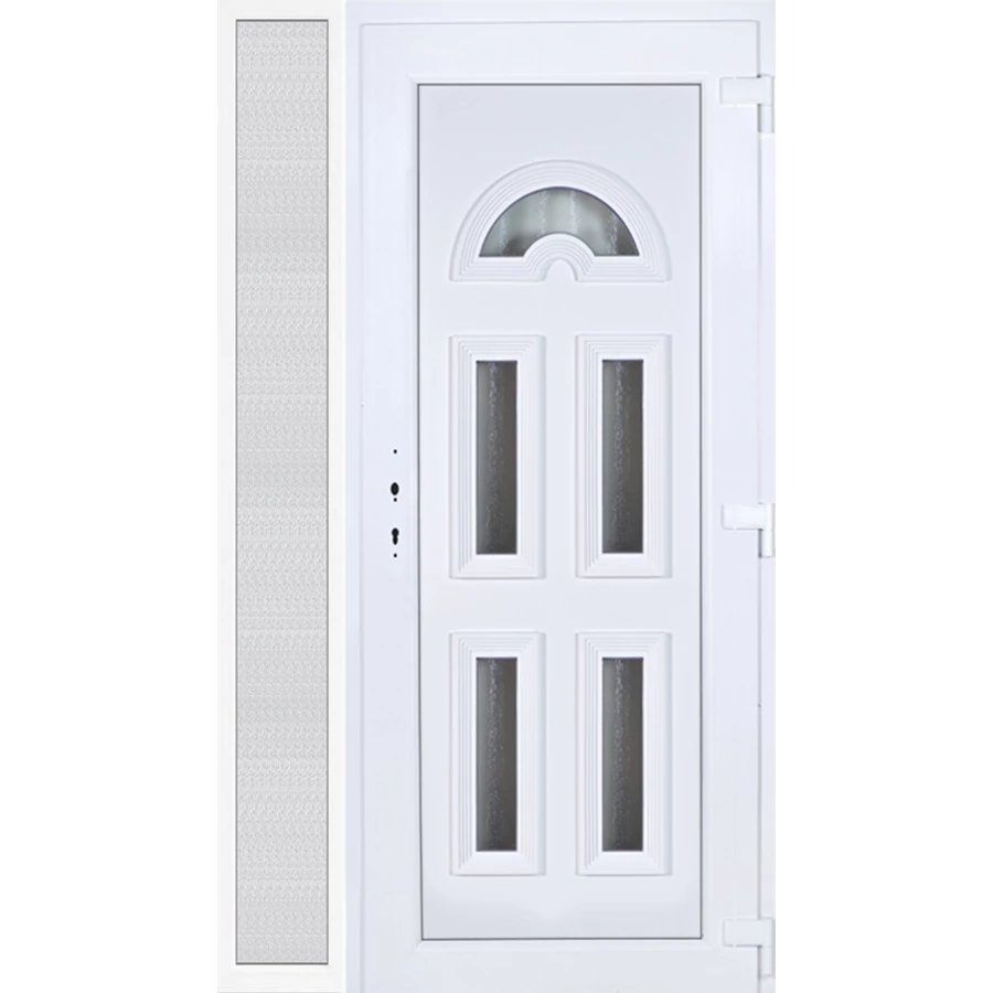 EXTRA hőszigetelésű műanyag bejárati ajtó 5 kamrás profilból, 70 mm beépítési mélységgel, tokban körbefutó idomacél merevítéssel. Vasalat: kilincsműködtetésű, 5 pontos ajtózárral, 3 db 3D erősített ajtópánttal, 20mm magas hőhídmentes alumínium küszöbbel, + 20mm purenittel a küszöb alatt. Dupla szürke ütközőtömítéssel rendelkezik. Üvegezése "savmart" katedrál 3 RÉTEGŰ Szuperlágybevonatos thermo üveg, 42 mm vastagságban, UG értéke: 0,7 W/m2K . A bejárati ajtó mindkét oldalán fehér színű. Nyitásmódja befelé nyíló, nyitásiránya jobbos ( bentről nézve a zsanér a jobb oldalon helyezkedik el ). Tényleges tokkülmérete: 128 cm széles 209 cm magas. 98 cm széles 209 cm magas bejárati ajtóból, 30 cm széles 209 cm magas fix "savmart" üvegezésű ( nem nyitható) oldalvilágítóból áll. ( két külön elem ami beépítéskor összeszerelendő). A nyílászáró ára nem tartalmazza a KILINCSET és a ZÁRBETÉTET a beszereléshez szükséges segédanyagokat (falkampó, csavar, pur-hab..stb.), külső-belső takaróléceket.