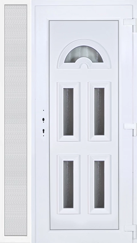 Kiváló hőszigetelésű műanyag bejárati ajtó 5 kamrás profilból, 70 mm beépítési mélységgel, tokban körbefutó idomacél merevítéssel. Vasalat: kilincsműködtetésű, 5 pontos ajtózárral, 3 db 3D erősített ajtópánttal, 35mm magas hőhídmentes alumínium küszöbbel. Dupla szürke ütközőtömítéssel rendelkezik. Üvegezése "GRÍZ" katedrál 2 rétegű Szuperlágybevonatos thermo üveg, 24 mm vastagságban, UG értéke: 1.0 W/m2K . A bejárati ajtó mindkét oldalán fehér színű. Nyitásmódja befelé nyíló, nyitásiránya jobbos ( bentről nézve a zsanér a jobb oldalon helyezkedik el ). Tényleges tokkülmérete: 128 cm széles 208,5 cm magas. 98 cm széles 208,5 cm magas bejárati ajtóból, 30 cm széles 208,5 cm magas fix "GRÍZ" üvegezésű ( nem nyitható) oldalvilágítóból áll. ( két külön elem ami beépítéskor összeszerelendő). A nyílászáró ára nem tartalmazza a KILINCSET és a ZÁRBETÉTET a beszereléshez szükséges segédanyagokat (falkampó, csavar, pur-hab..stb.), külső-belső takaróléceket.