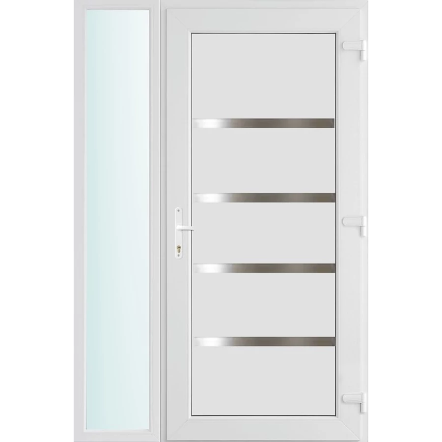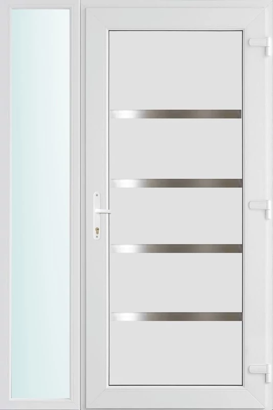 Kiváló hőszigetelésű műanyag bejárati ajtó 5 kamrás Pro line profilból, 70 mm beépítési mélységgel, tokban körbefutó idomacél merevítéssel. Vasalat: kilincsműködtetésű, VORNE 5 pontos ajtózárral, 3 db 3D erősített ajtópánttal, 20mm magas hőhídmentes alumínium küszöbbel. Dupla szürke ütközőtömítéssel rendelkezik. Üvegezése "SAVMART" katedrál 3 rétegű Szuperlágybevonatos thermo üveg, 40 mm vastagságban, UG értéke: 0.7 W/m2K . A bejárati ajtó mindkét oldalán fehér színű. Nyitásmódja befelé nyíló, nyitásiránya jobbos ( bentről nézve a zsanér a bal oldalon helyezkedik el ). Tényleges tokkülmérete: 128 cm széles 208 cm magas A nyílászáró ára nem tartalmazza a KILINCSET és a ZÁRBETÉTET a beszereléshez szükséges segédanyagokat (falkampó, csavar, pur-hab..stb.), külső-belső takaróléceket.