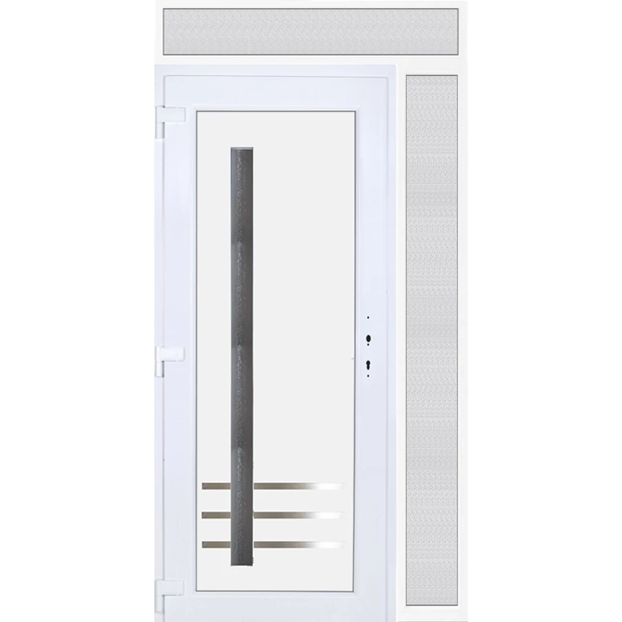 EXTRA hőszigetelésű műanyag bejárati ajtó 5 kamrás profilból, 70 mm beépítési mélységgel, tokban körbefutó idomacél merevítéssel. Vasalat: kilincsműködtetésű, 5 pontos ajtózárral, 3 db 3D erősített ajtópánttal, 20mm magas hőhídmentes alumínium küszöbbel, + 20mm purenittel a küszöb alatt. Dupla szürke ütközőtömítéssel rendelkezik. Üvegezése "savmart" katedrál 3 RÉTEGŰ Szuperlágybevonatos thermo üveg, 42 mm vastagságban, UG értéke: 0,7 W/m2K . A bejárati ajtó mindkét oldalán fehér színű. Nyitásmódja befelé nyíló, nyitásiránya balos ( bentről nézve a zsanér a bal oldalon helyezkedik el ). Tényleges tokkülmérete: 128 cm széles 239 cm magas. 98 cm széles 209 cm magas bejárati ajtóból, 30 cm széles 209 cm magas fix "savmart" üvegezésű ( nem nyitható) oldalvilágítóból és egy 128 cm széles 30 cm magas fix "savmart" üvegezésű ( nem nyitható) felülvilágítóból áll. ( három külön elem ami beépítéskor összeszerelendő). A nyílászáró ára nem tartalmazza a KILINCSET és a ZÁRBETÉTET a beszereléshez szükséges segédanyagokat (falkampó, csavar, pur-hab..stb.), külső-belső takaróléceket.