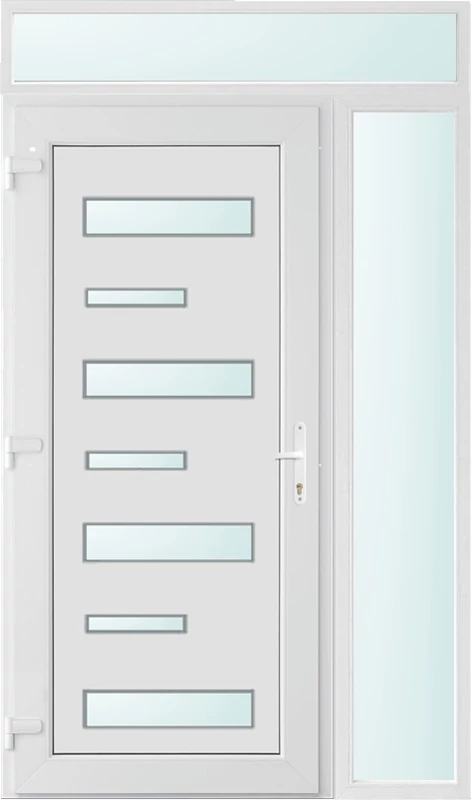 Kiváló hőszigetelésű műanyag bejárati ajtó 5 kamrás profilból, 70 mm beépítési mélységgel, tokban körbefutó idomacél merevítéssel. Vasalat: kilincsműködtetésű, VORNE 5 pontos ajtózárral, 3 db 3D erősített ajtópánttal, 20mm magas hőhídmentes alumínium küszöbbel. Dupla szürke ütközőtömítéssel rendelkezik. Üvegezése "SAVMART" katedrál 2 rétegű Szuperlágybevonatos thermo üveg, 24 mm vastagságban, UG értéke: 1.0 W/m2K . A bejárati ajtó mindkét oldalán fehér színű. Nyitásmódja befelé nyíló, nyitásiránya balos ( bentről nézve a zsanér a bal oldalon helyezkedik el ). Tényleges tokkülmérete: 98 cm széles 238 cm magas. 98 cm széles 208 cm magas bejárati ajtóból,98 cm széles 30 cm magas fix "SAVMART" üvegezésű ( nem nyitható) felülvilágítóból áll. ( két külön elem ami beépítéskor összeszerelendő). A nyílászáró ára nem tartalmazza a KILINCSET és a ZÁRBETÉTET a beszereléshez szükséges segédanyagokat (falkampó, csavar, pur-hab..stb.), külső-belső takaróléceket.