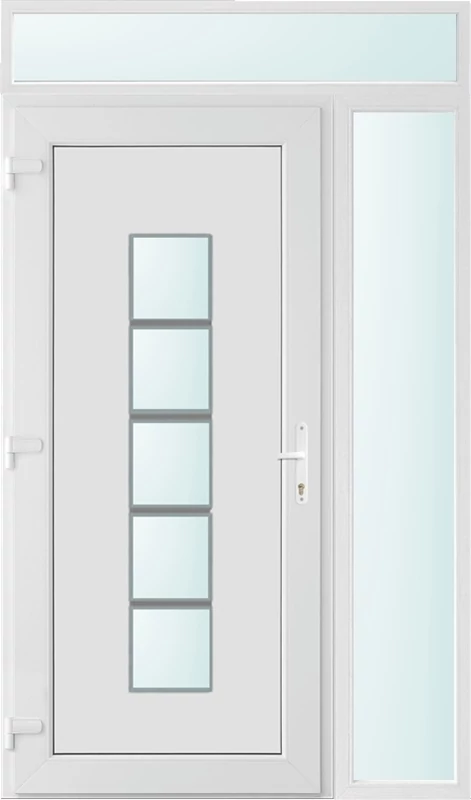 Kiváló hőszigetelésű műanyag bejárati ajtó 5 kamrás profilból, 70 mm beépítési mélységgel, tokban körbefutó idomacél merevítéssel. Vasalat: kilincsműködtetésű, VORNE 5 pontos ajtózárral, 3 db 3D erősített ajtópánttal, 20mm magas hőhídmentes alumínium küszöbbel. Dupla szürke ütközőtömítéssel rendelkezik. Üvegezése "SAVMART" katedrál 2 rétegű Szuperlágybevonatos thermo üveg, 24 mm vastagságban, UG értéke: 1.0 W/m2K . A bejárati ajtó mindkét oldalán fehér színű. Nyitásmódja befelé nyíló, nyitásiránya balos ( bentről nézve a zsanér a bal oldalon helyezkedik el ). Tényleges tokkülmérete: 128 cm széles 238 cm magas. 98 cm széles 208 cm magas bejárati ajtóból,30 cm széles 208 cm magas fix "SAVMART" üvegezésű ( nem nyitható) oldalvilágítóból és egy 128 cm széles 30 cm magas fix "SAVMART" üvegezésű ( nem nyitható) felülvilágítóból áll. ( három külön elem ami beépítéskor összeszerelendő). A nyílászáró ára nem tartalmazza a KILINCSET és a ZÁRBETÉTET a beszereléshez szükséges segédanyagokat (falkampó, csavar, pur-hab..stb.), külső-belső takaróléceket.
