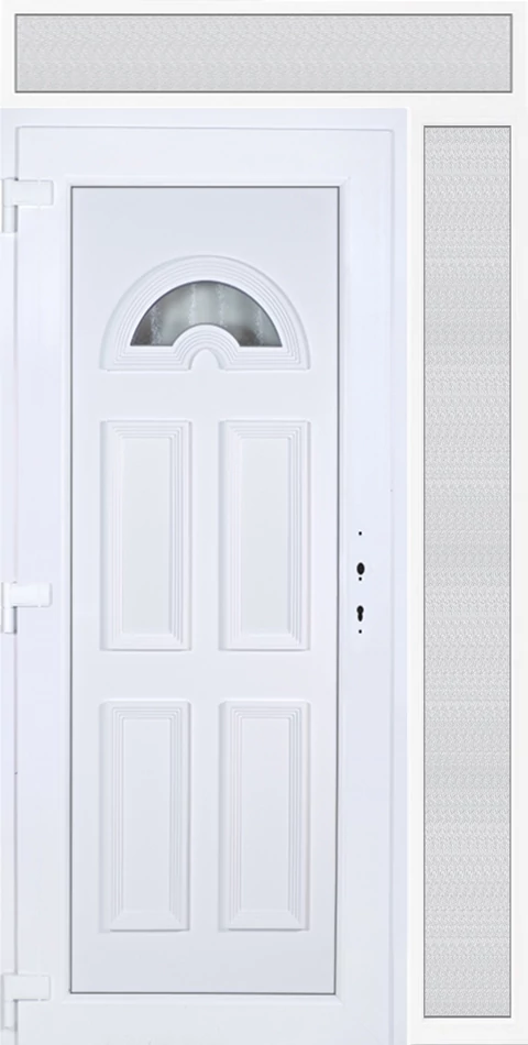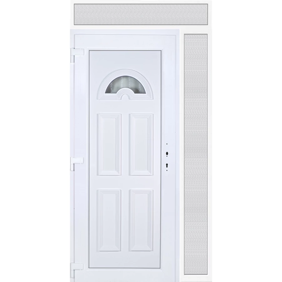 EXTRA hőszigetelésű műanyag bejárati ajtó 5 kamrás profilból, 70 mm beépítési mélységgel, tokban körbefutó idomacél merevítéssel. Vasalat: kilincsműködtetésű, 5 pontos ajtózárral, 3 db 3D erősített ajtópánttal, 20mm magas hőhídmentes alumínium küszöbbel, + 20mm purenittel a küszöb alatt. Dupla szürke ütközőtömítéssel rendelkezik. Üvegezése "savmart" katedrál 3 RÉTEGŰ Szuperlágybevonatos thermo üveg, 42 mm vastagságban, UG értéke: 0,7 W/m2K . A bejárati ajtó mindkét oldalán fehér színű. Nyitásmódja befelé nyíló, nyitásiránya balos ( bentről nézve a zsanér a bal oldalon helyezkedik el ). Tényleges tokkülmérete: 128 cm széles 239 cm magas. 98 cm széles 209 cm magas bejárati ajtóból, 30 cm széles 209 cm magas fix "savmart" üvegezésű ( nem nyitható) oldalvilágítóból és egy 128 cm széles 30 cm magas fix "savmart" üvegezésű ( nem nyitható) felülvilágítóból áll. ( három külön elem ami beépítéskor összeszerelendő). A nyílászáró ára nem tartalmazza a KILINCSET és a ZÁRBETÉTET a beszereléshez szükséges segédanyagokat (falkampó, csavar, pur-hab..stb.), külső-belső takaróléceket.