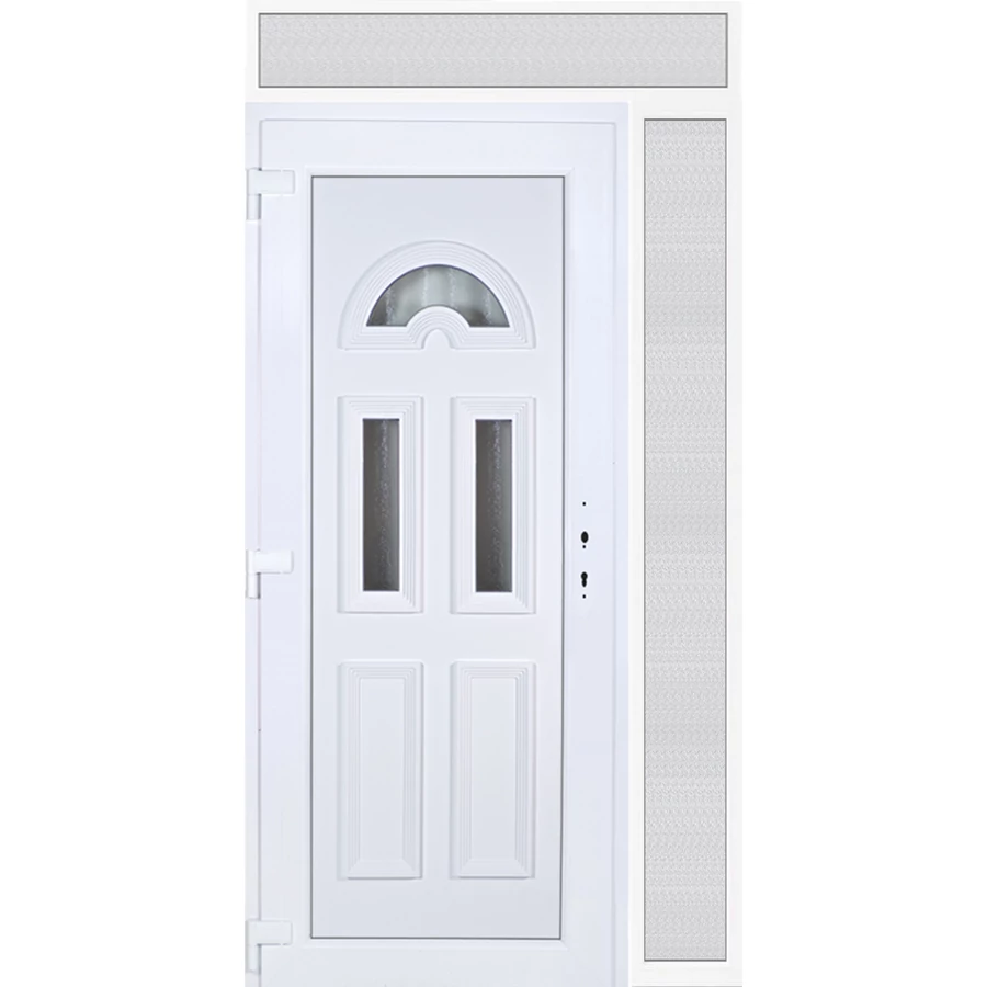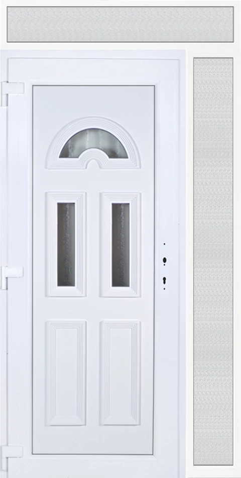 Kiváló hőszigetelésű műanyag bejárati ajtó 5 kamrás profilból, 70 mm beépítési mélységgel, tokban körbefutó idomacél merevítéssel. Vasalat: kilincsműködtetésű, 5 pontos ajtózárral, 3 db 3D erősített ajtópánttal, 35mm magas hőhídmentes alumínium küszöbbel. Dupla szürke ütközőtömítéssel rendelkezik. Üvegezése "GRÍZ" katedrál 2 rétegű Szuperlágybevonatos thermo üveg, 24 mm vastagságban, UG értéke: 1.0 W/m2K . A bejárati ajtó mindkét oldalán fehér színű. Nyitásmódja befelé nyíló, nyitásiránya balos ( bentről nézve a zsanér a bal oldalon helyezkedik el ). Tényleges tokkülmérete: 128 cm széles 238,5 cm magas. 98 cm széles 208,5 cm magas bejárati ajtóból,30 cm széles 208,5 cm magas fix "GRÍZ" üvegezésű ( nem nyitható) oldalvilágítóból és egy 128 cm széles 30 cm magas fix "GRÍZ" üvegezésű ( nem nyitható) felülvilágítóból áll. ( három külön elem ami beépítéskor összeszerelendő). A nyílászáró ára nem tartalmazza a KILINCSET és a ZÁRBETÉTET a beszereléshez szükséges segédanyagokat (falkampó, csavar, pur-hab..stb.), külső-belső takaróléceket.
