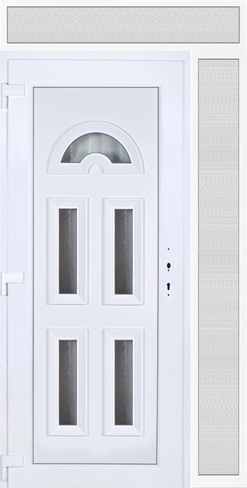 EXTRA hőszigetelésű műanyag bejárati ajtó 5 kamrás profilból, 70 mm beépítési mélységgel, tokban körbefutó idomacél merevítéssel. Vasalat: kilincsműködtetésű, 5 pontos ajtózárral, 3 db 3D erősített ajtópánttal, 20mm magas hőhídmentes alumínium küszöbbel, + 20mm purenittel a küszöb alatt. Dupla szürke ütközőtömítéssel rendelkezik. Üvegezése "savmart" katedrál 3 RÉTEGŰ Szuperlágybevonatos thermo üveg, 42 mm vastagságban, UG értéke: 0,7 W/m2K . A bejárati ajtó mindkét oldalán fehér színű. Nyitásmódja befelé nyíló, nyitásiránya balos ( bentről nézve a zsanér a bal oldalon helyezkedik el ). Tényleges tokkülmérete: 128 cm széles 239 cm magas. 98 cm széles 209 cm magas bejárati ajtóból, 30 cm széles 209 cm magas fix "savmart" üvegezésű ( nem nyitható) oldalvilágítóból és egy 128 cm széles 30 cm magas fix "savmart" üvegezésű ( nem nyitható) felülvilágítóból áll. ( három külön elem ami beépítéskor összeszerelendő). A nyílászáró ára nem tartalmazza a KILINCSET és a ZÁRBETÉTET a beszereléshez szükséges segédanyagokat (falkampó, csavar, pur-hab..stb.), külső-belső takaróléceket.