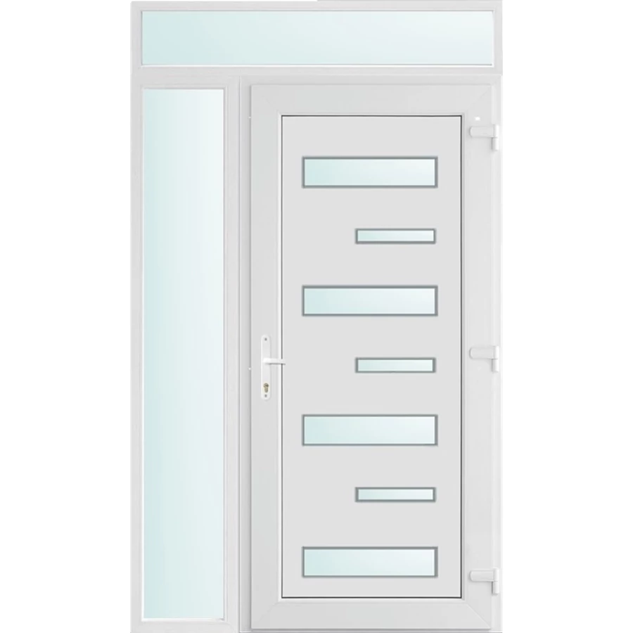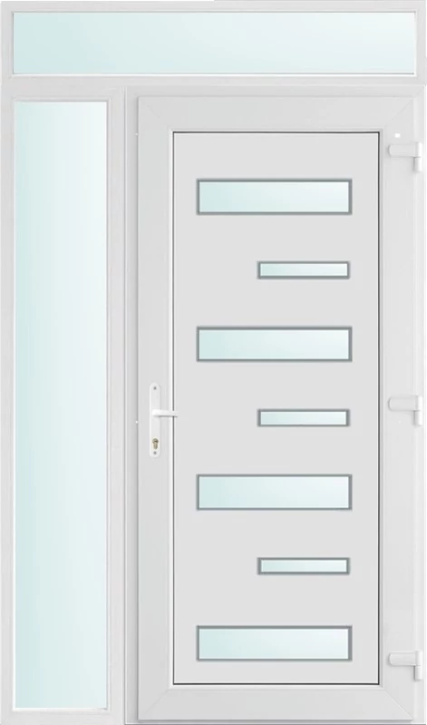 Műanyag bejárati ajtó 130x240 jobbos Alberta 7 üveges 3 rétegű üveggel extra vastag hőszigetelt panellal felül+oldalvilágítóval 5 kamrás fehér