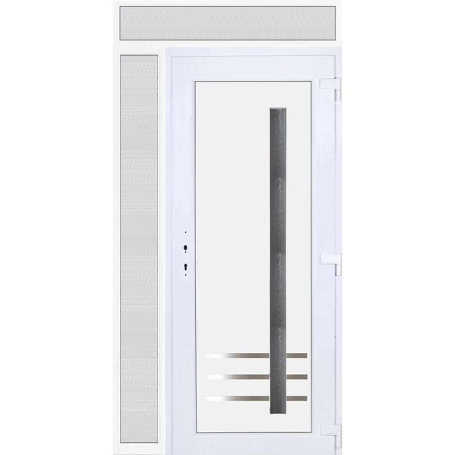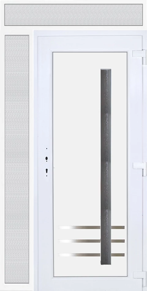 EXTRA hőszigetelésű műanyag bejárati ajtó 5 kamrás profilból, 70 mm beépítési mélységgel, tokban körbefutó idomacél merevítéssel. Vasalat: kilincsműködtetésű, 5 pontos ajtózárral, 3 db 3D erősített ajtópánttal, 20mm magas hőhídmentes alumínium küszöbbel, + 20mm purenittel a küszöb alatt. Dupla szürke ütközőtömítéssel rendelkezik. Üvegezése "savmart" katedrál 3 RÉTEGŰ Szuperlágybevonatos thermo üveg, 42 mm vastagságban, UG értéke: 0,7 W/m2K . A bejárati ajtó mindkét oldalán fehér színű. Nyitásmódja befelé nyíló, nyitásiránya jobbos ( bentről nézve a zsanér a jobb oldalon helyezkedik el ). Tényleges tokkülmérete: 128 cm széles 239 cm magas. 98 cm széles 209 cm magas bejárati ajtóból, 30 cm széles 209 cm magas fix "savmart" üvegezésű ( nem nyitható) oldalvilágítóból és egy 128 cm széles 30 cm magas fix "savmart" üvegezésű ( nem nyitható) felülvilágítóból áll. ( három külön elem ami beépítéskor összeszerelendő). A nyílászáró ára nem tartalmazza a KILINCSET és a ZÁRBETÉTET a beszereléshez szükséges segédanyagokat (falkampó, csavar, pur-hab..stb.), külső-belső takaróléceket.