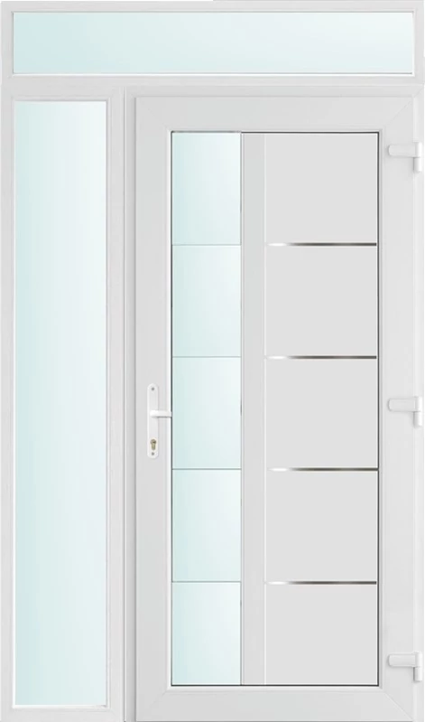 Kiváló hőszigetelésű műanyag bejárati ajtó 5 kamrás profilból, 70 mm beépítési mélységgel, tokban körbefutó idomacél merevítéssel. Vasalat: kilincsműködtetésű, VORNE 5 pontos ajtózárral, 3 db 3D erősített ajtópánttal, 20mm magas hőhídmentes alumínium küszöbbel. Dupla szürke ütközőtömítéssel rendelkezik. Üvegezése "SAVMART" katedrál 2 rétegű Szuperlágybevonatos thermo üveg, 24 mm vastagságban, UG értéke: 1.0 W/m2K . A bejárati ajtó mindkét oldalán fehér színű. Nyitásmódja befelé nyíló, nyitásiránya jobbos ( bentről nézve a zsanér a jobb oldalon helyezkedik el ). Tényleges tokkülmérete: 128 cm széles 238 cm magas. 98 cm széles 208 cm magas bejárati ajtóból,30 cm széles 208 cm magas fix "SAVMART" üvegezésű ( nem nyitható) oldalvilágítóból és egy 128 cm széles 30 cm magas fix "SAVMART" üvegezésű ( nem nyitható) felülvilágítóból áll. ( három külön elem ami beépítéskor összeszerelendő). A nyílászáró ára nem tartalmazza a KILINCSET és a ZÁRBETÉTET a beszereléshez szükséges segédanyagokat (falkampó, csavar, pur-hab..stb.), külső-belső takaróléceket.
