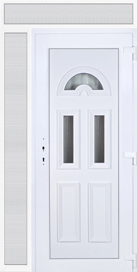 EXTRA hőszigetelésű műanyag bejárati ajtó 5 kamrás profilból, 70 mm beépítési mélységgel, tokban körbefutó idomacél merevítéssel. Vasalat: kilincsműködtetésű, 5 pontos ajtózárral, 3 db 3D erősített ajtópánttal, 20mm magas hőhídmentes alumínium küszöbbel, + 20mm purenittel a küszöb alatt. Dupla szürke ütközőtömítéssel rendelkezik. Üvegezése "savmart" katedrál 3 RÉTEGŰ Szuperlágybevonatos thermo üveg, 42 mm vastagságban, UG értéke: 0,7 W/m2K . A bejárati ajtó mindkét oldalán fehér színű. Nyitásmódja befelé nyíló, nyitásiránya jobbos ( bentről nézve a zsanér a jobb oldalon helyezkedik el ). Tényleges tokkülmérete: 128 cm széles 239 cm magas. 98 cm széles 209 cm magas bejárati ajtóból, 30 cm széles 209 cm magas fix "savmart" üvegezésű ( nem nyitható) oldalvilágítóból és egy 128 cm széles 30 cm magas fix "savmart" üvegezésű ( nem nyitható) felülvilágítóból áll. ( három külön elem ami beépítéskor összeszerelendő). A nyílászáró ára nem tartalmazza a KILINCSET és a ZÁRBETÉTET a beszereléshez szükséges segédanyagokat (falkampó, csavar, pur-hab..stb.), külső-belső takaróléceket.