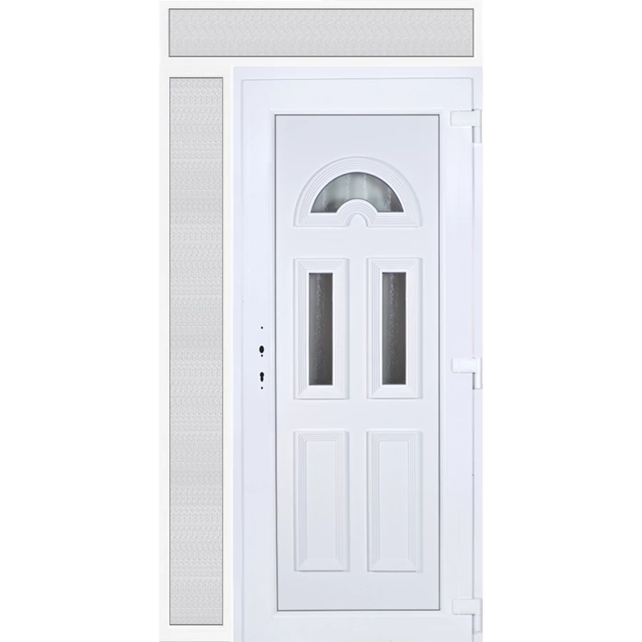 Kiváló hőszigetelésű műanyag bejárati ajtó 5 kamrás profilból, 70 mm beépítési mélységgel, tokban körbefutó idomacél merevítéssel. Vasalat: kilincsműködtetésű, 5 pontos ajtózárral, 3 db 3D erősített ajtópánttal, 35mm magas hőhídmentes alumínium küszöbbel. Dupla szürke ütközőtömítéssel rendelkezik. Üvegezése "GRÍZ" katedrál 2 rétegű Szuperlágybevonatos thermo üveg, 24 mm vastagságban, UG értéke: 1.0 W/m2K . A bejárati ajtó mindkét oldalán fehér színű. Nyitásmódja befelé nyíló, nyitásiránya jobbos ( bentről nézve a zsanér a jobb oldalon helyezkedik el ). Tényleges tokkülmérete: 128 cm széles 238,5 cm magas. 98 cm széles 208,5 cm magas bejárati ajtóból,30 cm széles 208,5 cm magas fix "GRÍZ" üvegezésű ( nem nyitható) oldalvilágítóból és egy 128 cm széles 30 cm magas fix "GRÍZ" üvegezésű ( nem nyitható) felülvilágítóból áll. ( három külön elem ami beépítéskor összeszerelendő). A nyílászáró ára nem tartalmazza a KILINCSET és a ZÁRBETÉTET a beszereléshez szükséges segédanyagokat (falkampó, csavar, pur-hab..stb.), külső-belső takaróléceket.