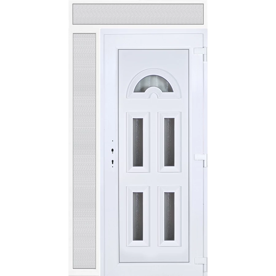 Kiváló hőszigetelésű műanyag bejárati ajtó 5 kamrás profilból, 70 mm beépítési mélységgel, tokban körbefutó idomacél merevítéssel. Vasalat: kilincsműködtetésű, 5 pontos ajtózárral, 3 db 3D erősített ajtópánttal, 35mm magas hőhídmentes alumínium küszöbbel. Dupla szürke ütközőtömítéssel rendelkezik. Üvegezése "GRÍZ" katedrál 2 rétegű Szuperlágybevonatos thermo üveg, 24 mm vastagságban, UG értéke: 1.0 W/m2K . A bejárati ajtó mindkét oldalán fehér színű. Nyitásmódja befelé nyíló, nyitásiránya jobbos ( bentről nézve a zsanér a jobb oldalon helyezkedik el ). Tényleges tokkülmérete: 128 cm széles 238,5 cm magas. 98 cm széles 208,5 cm magas bejárati ajtóból,30 cm széles 208,5 cm magas fix "GRÍZ" üvegezésű ( nem nyitható) oldalvilágítóból és egy 128 cm széles 30 cm magas fix "GRÍZ" üvegezésű ( nem nyitható) felülvilágítóból áll. ( három külön elem ami beépítéskor összeszerelendő). A nyílászáró ára nem tartalmazza a KILINCSET és a ZÁRBETÉTET a beszereléshez szükséges segédanyagokat (falkampó, csavar, pur-hab..stb.), külső-belső takaróléceket.
