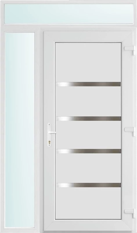 Kiváló hőszigetelésű műanyag bejárati ajtó 5 kamrás profilból, 70 mm beépítési mélységgel, tokban körbefutó idomacél merevítéssel. Vasalat: kilincsműködtetésű, VORNE 5 pontos ajtózárral, 3 db 3D erősített ajtópánttal, 20mm magas hőhídmentes alumínium küszöbbel. Dupla szürke ütközőtömítéssel rendelkezik. Üvegezése "SAVMART" katedrál 2 rétegű Szuperlágybevonatos thermo üveg, 24 mm vastagságban, UG értéke: 1.0 W/m2K . A bejárati ajtó mindkét oldalán fehér színű. Nyitásmódja befelé nyíló, nyitásiránya jobbos ( bentről nézve a zsanér a jobb oldalon helyezkedik el ). Tényleges tokkülmérete: 128 cm széles 238 cm magas. 98 cm széles 208 cm magas bejárati ajtóból,30 cm széles 208 cm magas fix "SAVMART" üvegezésű ( nem nyitható) oldalvilágítóból és egy 128 cm széles 30 cm magas fix "SAVMART" üvegezésű ( nem nyitható) felülvilágítóból áll. ( három külön elem ami beépítéskor összeszerelendő). A nyílászáró ára nem tartalmazza a KILINCSET és a ZÁRBETÉTET a beszereléshez szükséges segédanyagokat (falkampó, csavar, pur-hab..stb.), külső-belső takaróléceket.