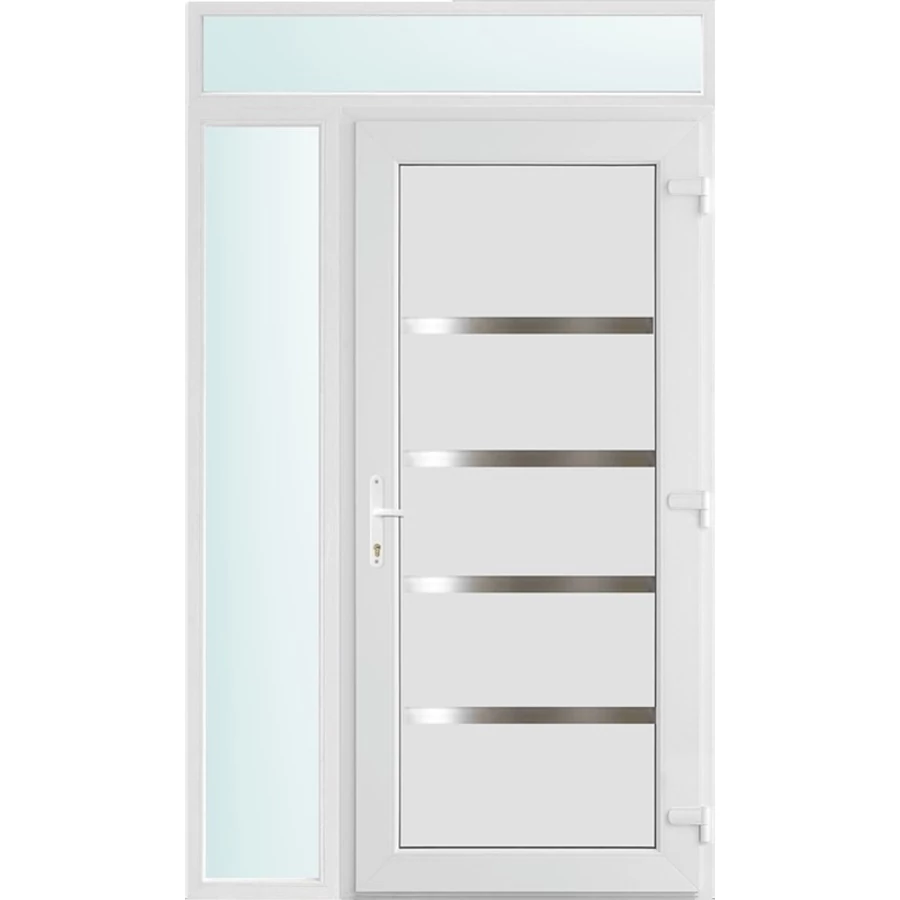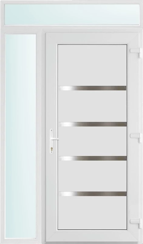 Kiváló hőszigetelésű műanyag bejárati ajtó 5 kamrás Pro line profilból, 70 mm beépítési mélységgel, tokban körbefutó idomacél merevítéssel. Vasalat: kilincsműködtetésű, VORNE 5 pontos ajtózárral, 3 db 3D erősített ajtópánttal, 20mm magas hőhídmentes alumínium küszöbbel. Dupla szürke ütközőtömítéssel rendelkezik. Üvegezése "SAVMART" katedrál 3 rétegű Szuperlágybevonatos thermo üveg, 40 mm vastagságban, UG értéke: 0.7 W/m2K . A bejárati ajtó mindkét oldalán fehér színű. Nyitásmódja befelé nyíló, nyitásiránya jobbos ( bentről nézve a zsanér a bal oldalon helyezkedik el ). Tényleges tokkülmérete: 128 cm széles 238 cm magas A nyílászáró ára nem tartalmazza a KILINCSET és a ZÁRBETÉTET a beszereléshez szükséges segédanyagokat (falkampó, csavar, pur-hab..stb.), külső-belső takaróléceket.