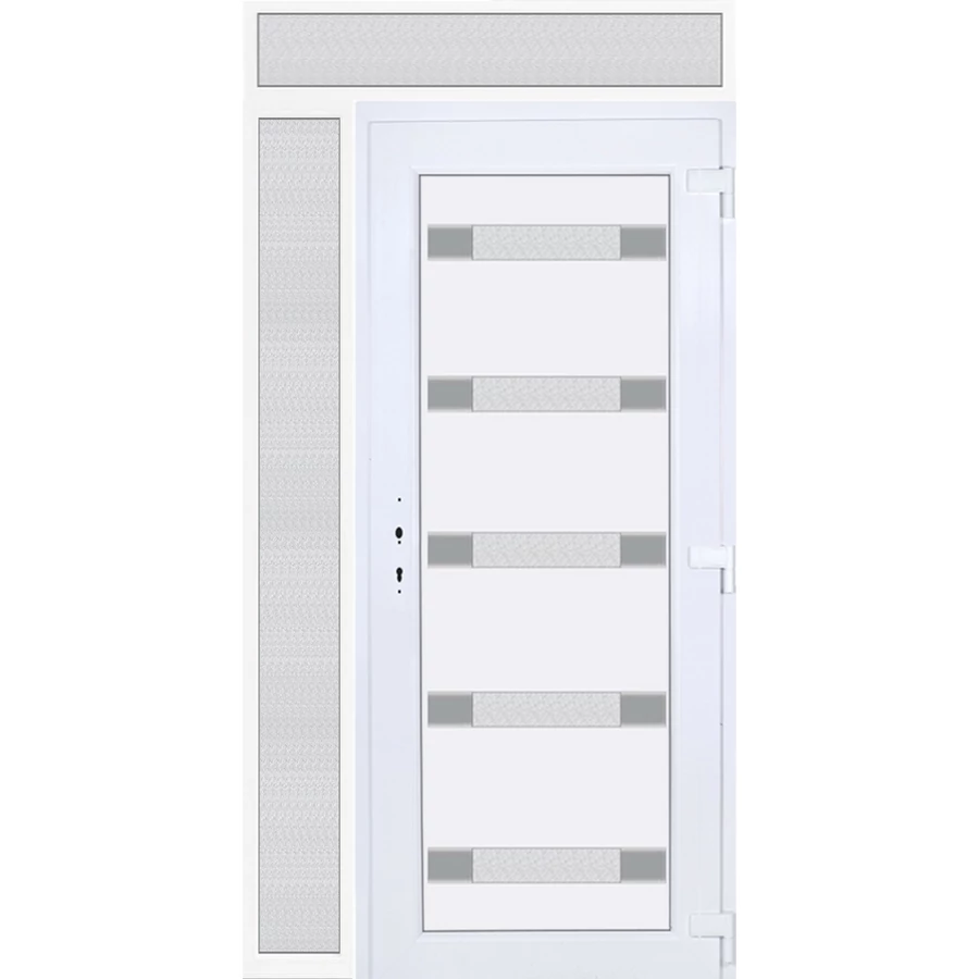 EXTRA hőszigetelésű műanyag bejárati ajtó 5 kamrás profilból, 70 mm beépítési mélységgel, tokban körbefutó idomacél merevítéssel. Vasalat: kilincsműködtetésű, 5 pontos ajtózárral, 3 db 3D erősített ajtópánttal, 20mm magas hőhídmentes alumínium küszöbbel, + 20mm purenittel a küszöb alatt. Dupla szürke ütközőtömítéssel rendelkezik. Üvegezése "savmart" katedrál 3 RÉTEGŰ Szuperlágybevonatos thermo üveg, 42 mm vastagságban, UG értéke: 0,7 W/m2K . A bejárati ajtó mindkét oldalán fehér színű. Nyitásmódja befelé nyíló, nyitásiránya jobbos ( bentről nézve a zsanér a jobb oldalon helyezkedik el ). Tényleges tokkülmérete: 128 cm széles 239 cm magas. 98 cm széles 209 cm magas bejárati ajtóból, 30 cm széles 209 cm magas fix "savmart" üvegezésű ( nem nyitható) oldalvilágítóból és egy 128 cm széles 30 cm magas fix "savmart" üvegezésű ( nem nyitható) felülvilágítóból áll. ( három külön elem ami beépítéskor összeszerelendő). A nyílászáró ára nem tartalmazza a KILINCSET és a ZÁRBETÉTET a beszereléshez szükséges segédanyagokat (falkampó, csavar, pur-hab..stb.), külső-belső takaróléceket.