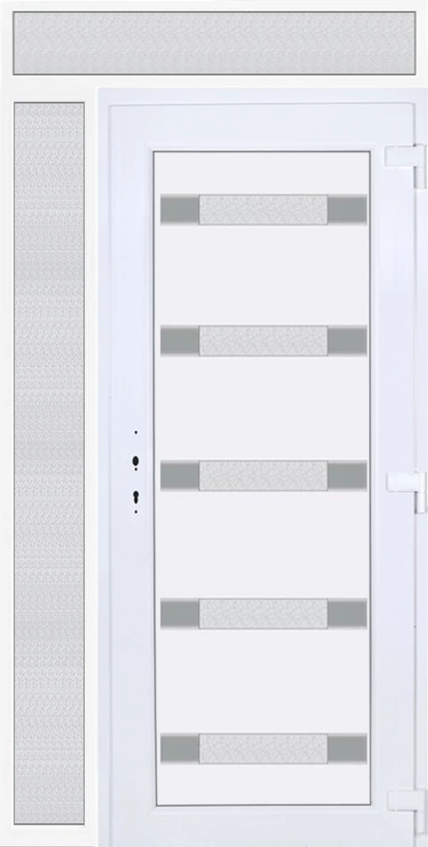 Kiváló hőszigetelésű műanyag bejárati ajtó 5 kamrás profilból, 70 mm beépítési mélységgel, tokban körbefutó idomacél merevítéssel. Vasalat: kilincsműködtetésű, 5 pontos ajtózárral, 3 db 3D erősített ajtópánttal, 35mm magas hőhídmentes alumínium küszöbbel. Dupla szürke ütközőtömítéssel rendelkezik. Üvegezése "GRÍZ" katedrál 2 rétegű Szuperlágybevonatos thermo üveg, 24 mm vastagságban, UG értéke: 1.0 W/m2K . A bejárati ajtó mindkét oldalán fehér színű. Nyitásmódja befelé nyíló, nyitásiránya jobbos ( bentről nézve a zsanér a jobb oldalon helyezkedik el ). Tényleges tokkülmérete: 128 cm széles 238,5 cm magas. 98 cm széles 208,5 cm magas bejárati ajtóból,30 cm széles 208,5 cm magas fix "GRÍZ" üvegezésű ( nem nyitható) oldalvilágítóból és egy 128 cm széles 30 cm magas fix "GRÍZ" üvegezésű ( nem nyitható) felülvilágítóból áll. ( három külön elem ami beépítéskor összeszerelendő). A nyílászáró ára nem tartalmazza a KILINCSET és a ZÁRBETÉTET a beszereléshez szükséges segédanyagokat (falkampó, csavar, pur-hab..stb.), külső-belső takaróléceket.