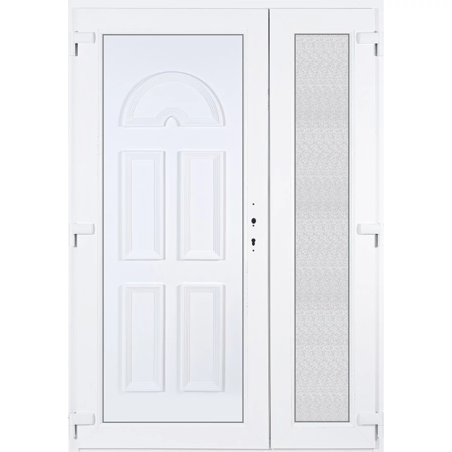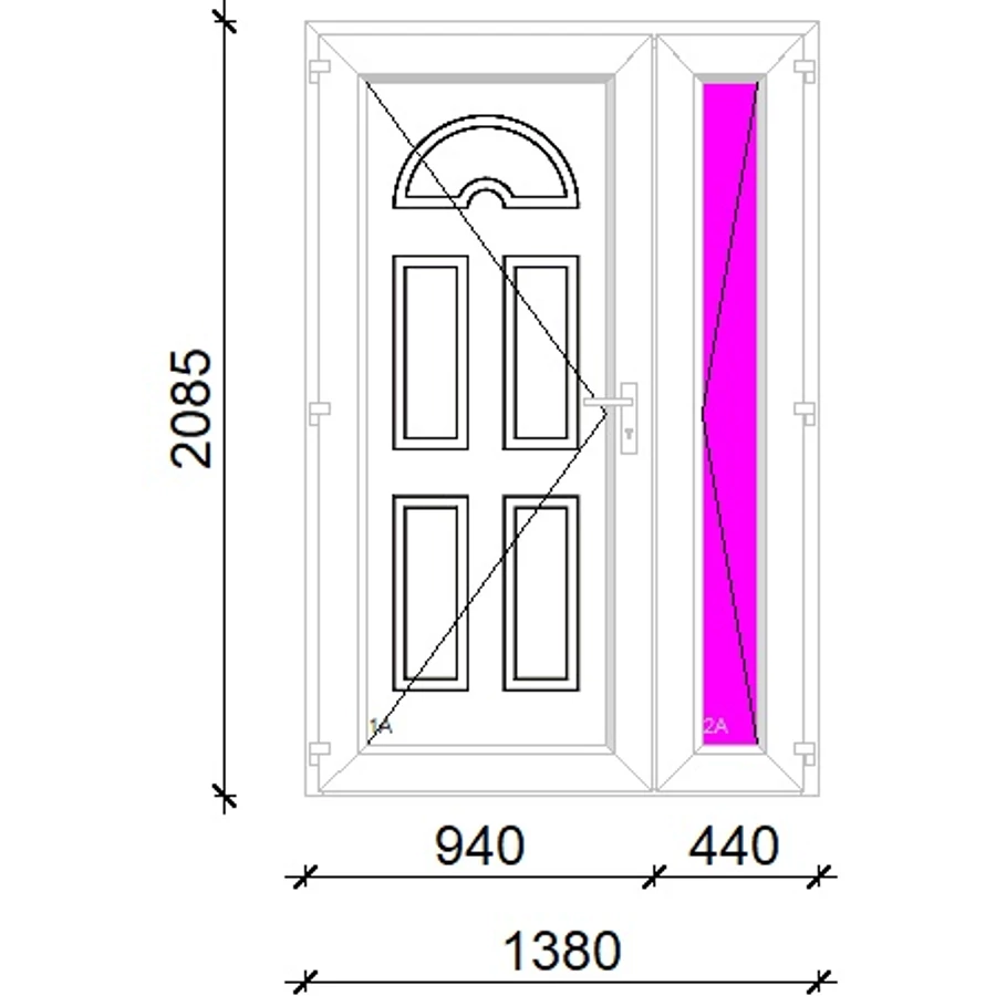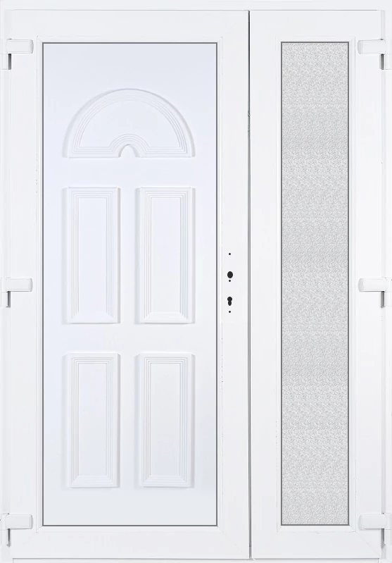 EXTRA hőszigetelésű műanyag bejárati ajtó 5 kamrás profilból, 70 mm beépítési mélységgel, tokban körbefutó idomacél merevítéssel. Vasalat: kilincsműködtetésű, 5 pontos ajtózárral, 3 db 3D erősített ajtópánttal, 20mm magas hőhídmentes alumínium küszöbbel, + 20mm purenittel a küszöb alatt. Dupla szürke ütközőtömítéssel rendelkezik. Üvegezése "savmart" katedrál 3 RÉTEGŰ Szuperlágybevonatos thermo üveg, 42 mm vastagságban, UG értéke: 0,7 W/m2K . A bejárati ajtó mindkét oldalán fehér színű. Nyitásmódja 2 szárnyú befelé nyíló, nyitásiránya balos ( bentről nézve a bal oldali a nagyobb nyíló szárny ). Tényleges tokkülmérete: 138 cm széles 209 cm magas. A nyílászáró ára nem tartalmazza a KILINCSET és a ZÁRBETÉTET a beszereléshez szükséges segédanyagokat (falkampó, csavar, pur-hab..stb.), külső-belső takaróléceket.