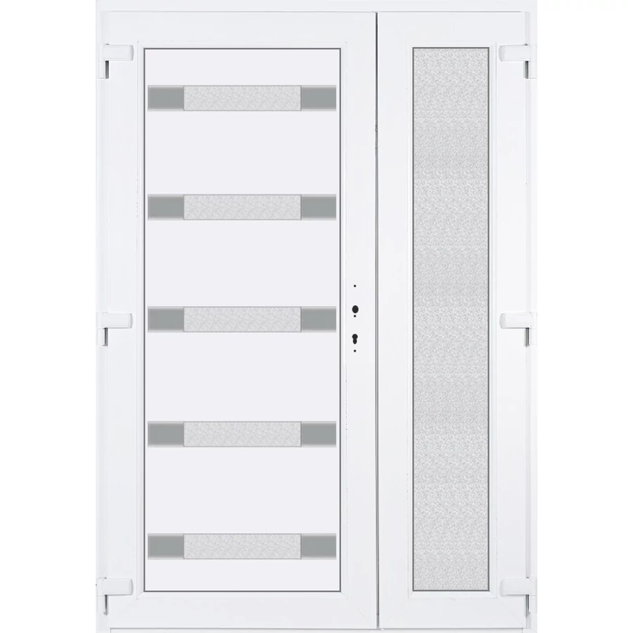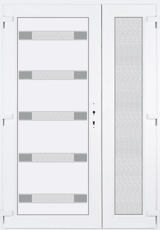 Kiváló hőszigetelésű műanyag bejárati ajtó 5 kamrás profilból, 70 mm beépítési mélységgel, tokban körbefutó idomacél merevítéssel. Vasalat: kilincsműködtetésű, 5 pontos ajtózárral, 3 db 3D erősített ajtópánttal, 35mm magas hőhídmentes alumínium küszöbbel. Dupla szürke ütközőtömítéssel rendelkezik. Üvegezése "GRÍZ" katedrál 2 rétegű Szuperlágybevonatos thermo üveg, 24 mm vastagságban, UG értéke: 1.0 W/m2K, a kisebb szárnyba végigfutó "GRÍZ" katedrál 2 rétegű Szuperlágybevonatos thermo üveg, 24 mm vastagságban kerül . A bejárati ajtó mindkét oldalán fehér színű. Nyitásmódja 2 szárnyú befelé nyíló, nyitásiránya balos ( bentről nézve a bal oldali a nagyobb nyíló szárny ). Tényleges tokkülmérete: 138 cm széles 208,5 cm magas. A nyílászáró ára nem tartalmazza a KILINCSET és a ZÁRBETÉTET a beszereléshez szükséges segédanyagokat (falkampó, csavar, pur-hab..stb.), külső-belső takaróléceket.